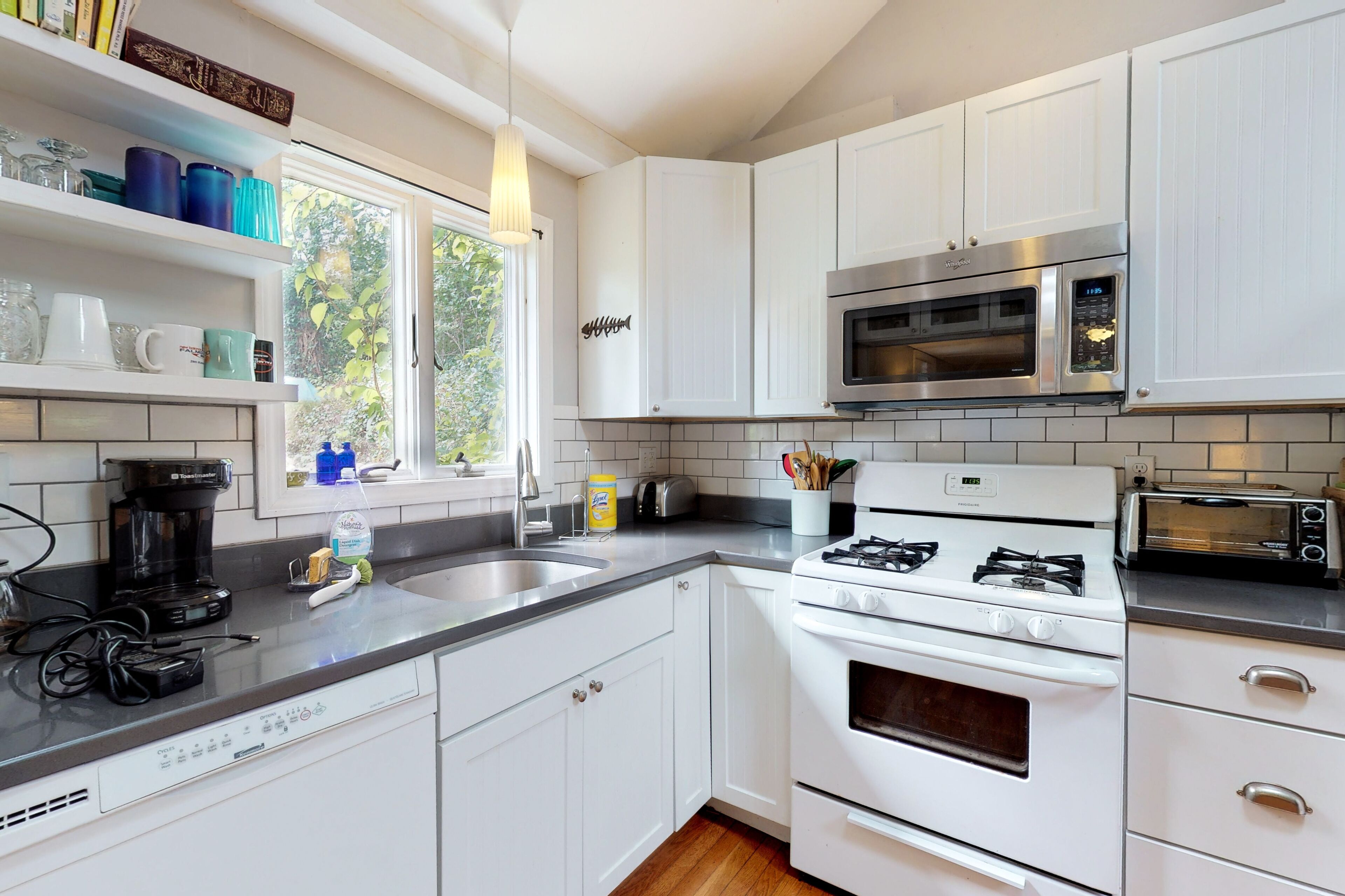 An arched ship's doorway connects to the all-new, modern kitchen with dishwasher, microwave, ceramic radiant cooktop, electric oven, fridge and freezer. It's finished with sand-colored granite counters, oyster shell backsplash, and brass boat cleat cabinet knobs. You'll find all the cookware and utensils needed for a lobster boil or anything else you want to cook or bake, whether indoors or on the gas grill. We stock a few coastal New England cookbooks and essential small appliances including toaster, tea kettle, Keurig and drip coffee makers, blender, rice cooker and small food processor (chopper).