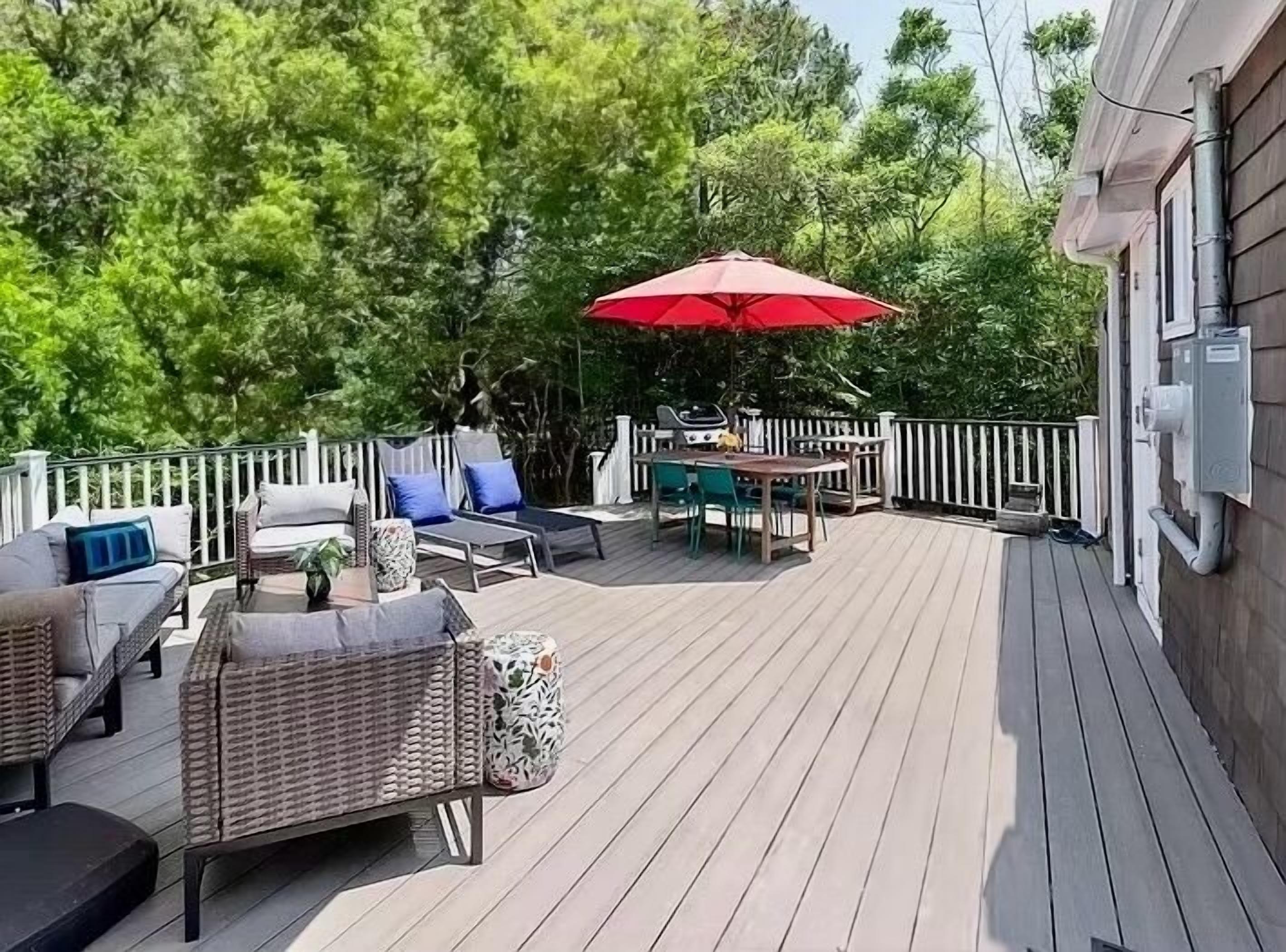 The large deck has an outdoor shower with a view of the backyard, lounge chairs, a sun umbrella, a Weber grill, 2 eating areas and a cabinet with beach umbrellas, chairs and toys.