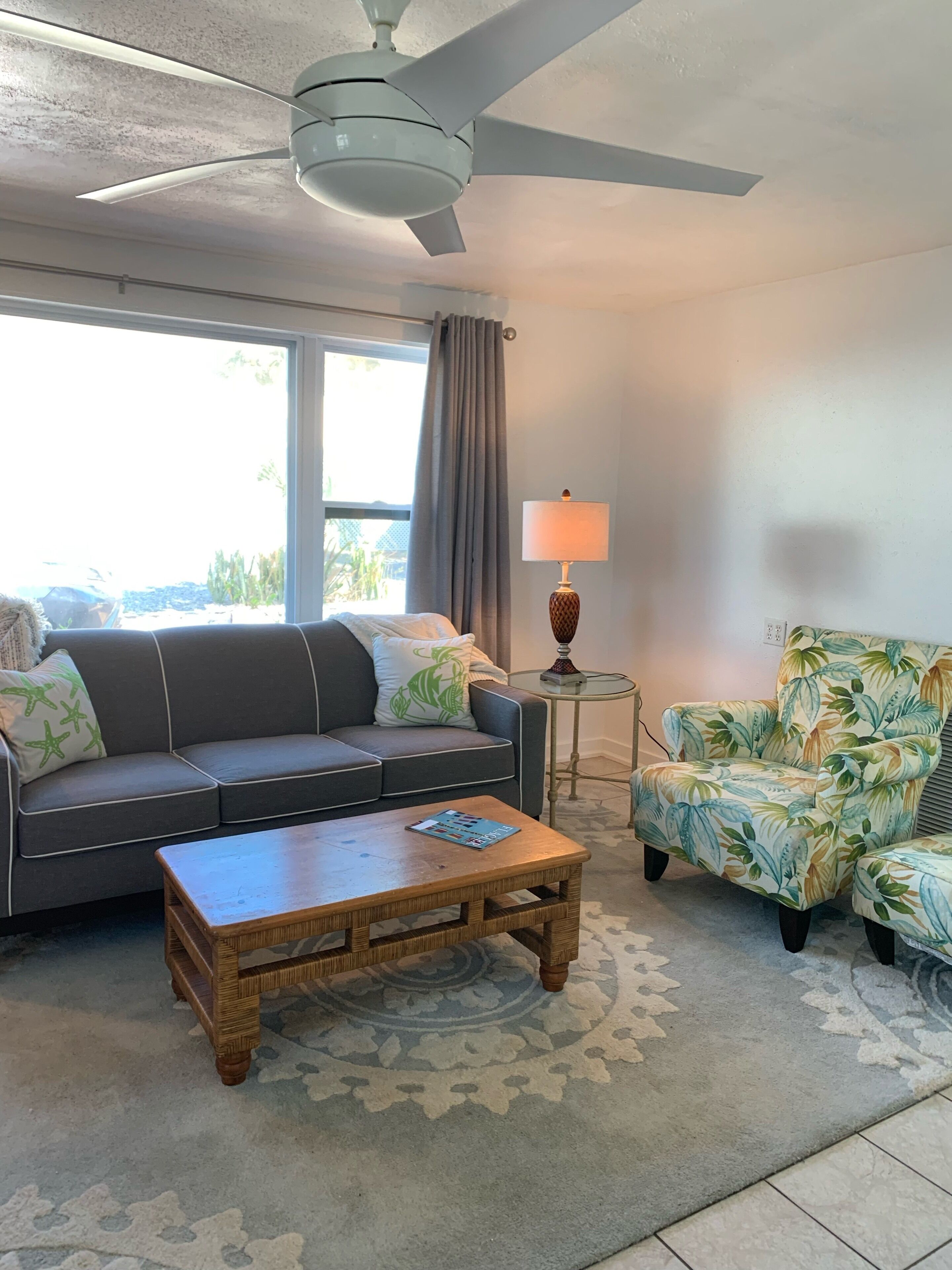 This cozy cottage features a queen-sized bedroom, a welcoming living room, a private bath, and a fully appointed kitchen, ensuring comfort and convenience throughout your stay. Its open-beamed wood ceilings and terrazzo floors evoke the nostalgic charm of old Florida vacationing, while modern amenities—including flat-screen TVs in both the living room and bedroom, high-speed Wi-Fi, a dishwasher, and designated parking—provide everything you need for a seamless stay. For an added touch of convenience, Sea Grape Cottage offers a private outdoor shower just steps from the bedroom door.
