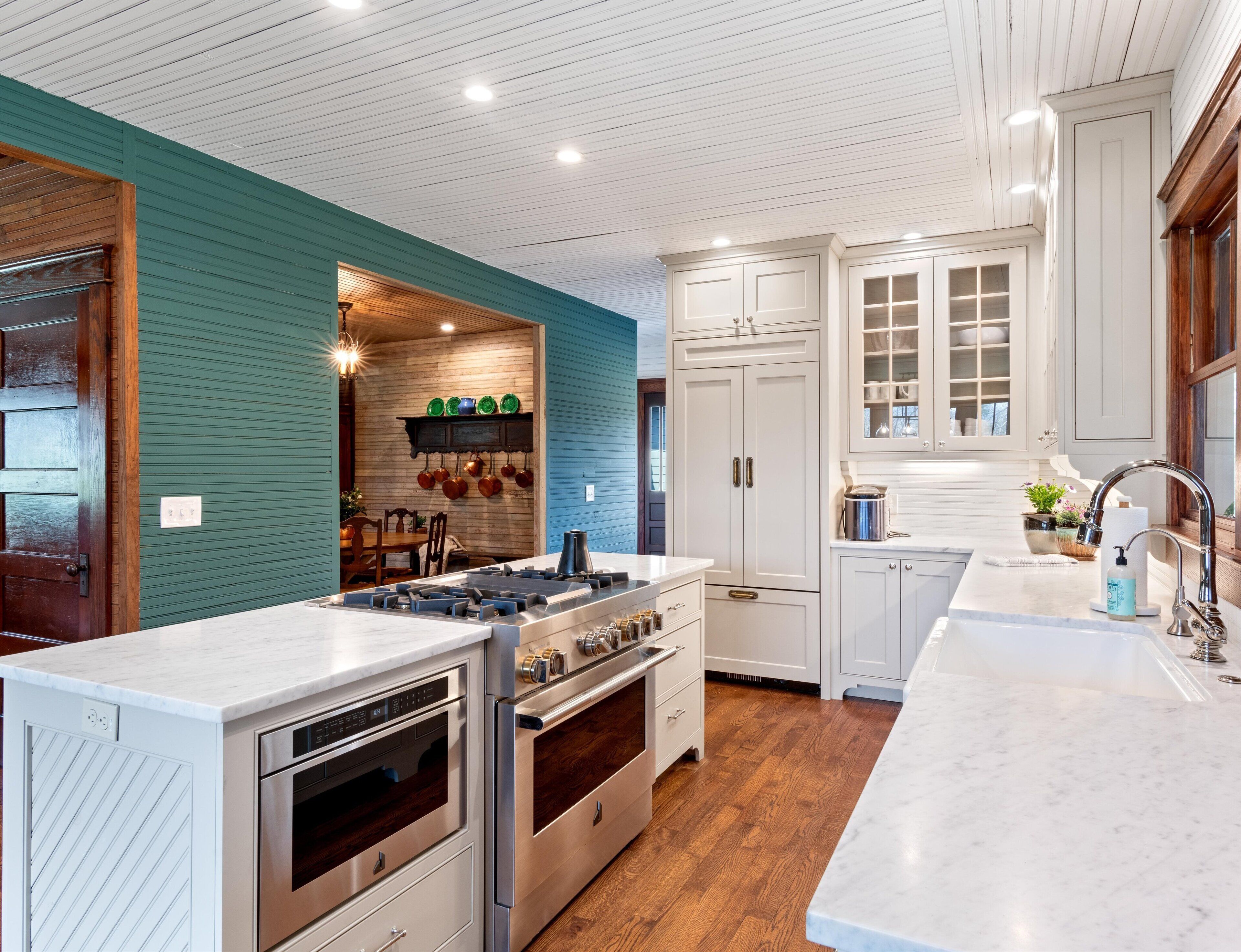 Every detail has been meticulously considered, including the floors which are made of reclaimed elm from a threshing mill. A brick fireplace was found hidden inside the walls and has been exposed and reassembled to create a new gas fireplace and the wall above it is faced with the poplar wood from the original sub flooring of the house. The original wood siding of the house was milled and used as an accent wall in the kitchen.