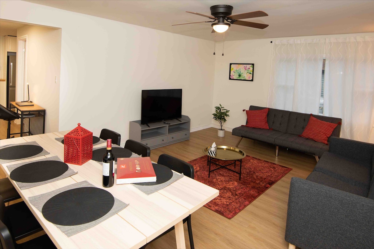 Guests will have access to the entire apartment, including the bedroom. The apartment features amenities such as air conditioning, a kitchen with a dishwasher, microwave, refrigerator, stove, and toaster, a TV, and wireless internet. Guests can also enjoy the BBQ grill. On-site street parking is available.