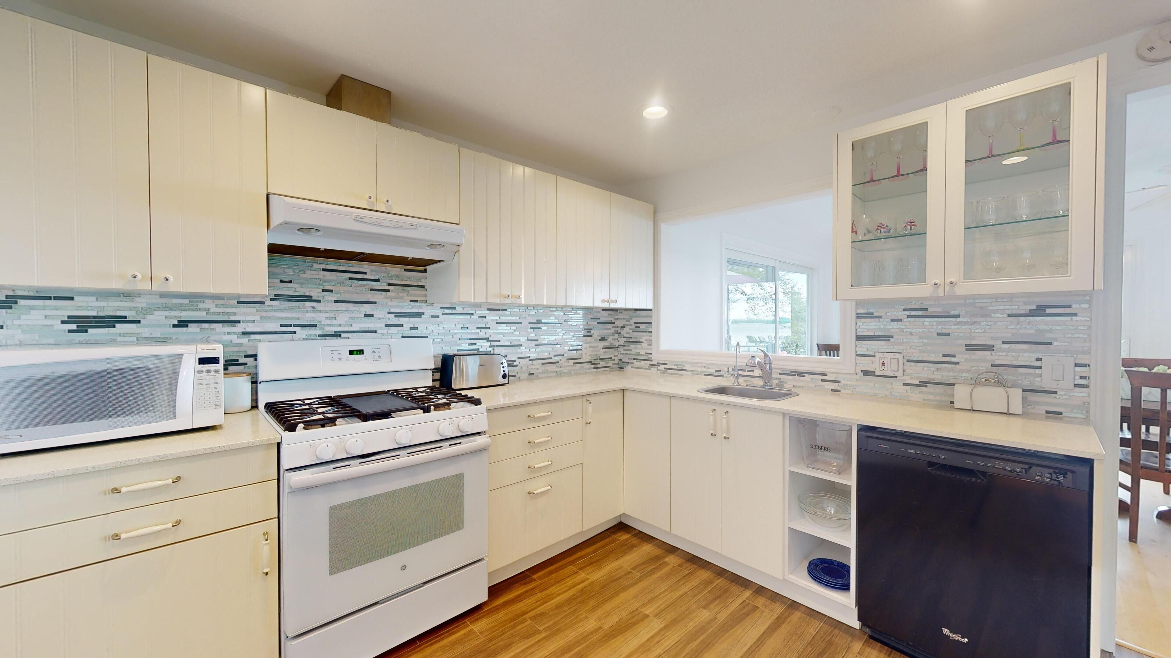 ✔ Main kitchen: fully stocked, open-concept with floor-to-ceiling lakeview windows, plus a bright sunroom breakfast area