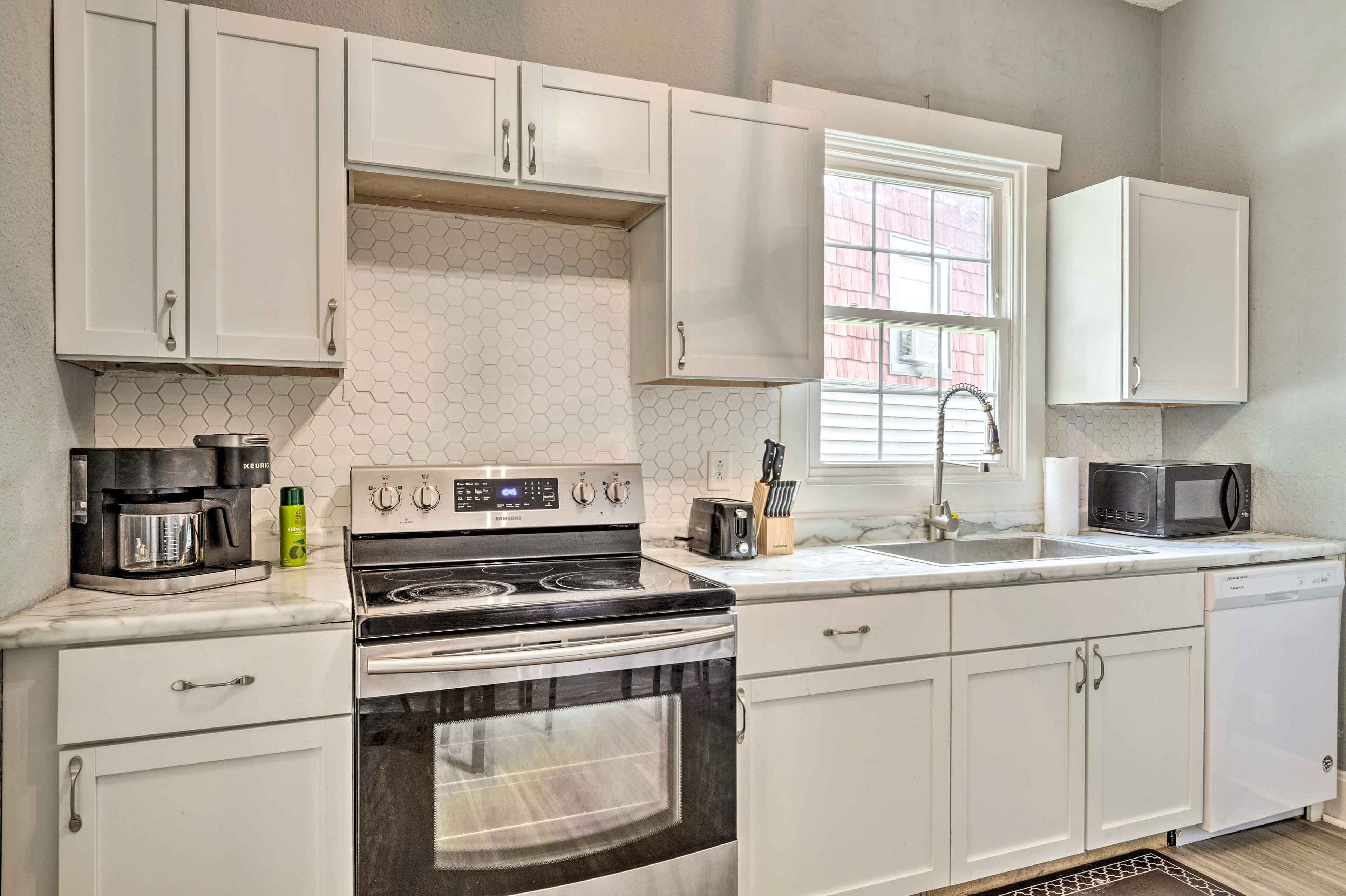 Our fully stocked kitchen features stainless appliances and offers everything you need if you feel like cooking in -- pots, pans, dish towels, dishware, glasses, and utensils. Kitchen island has stools for four, plus we provide tea/coffee and sugar/powdered creamer.