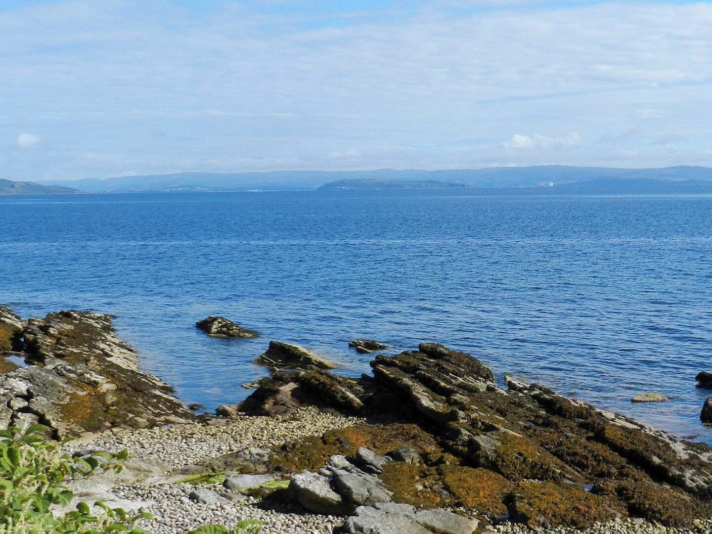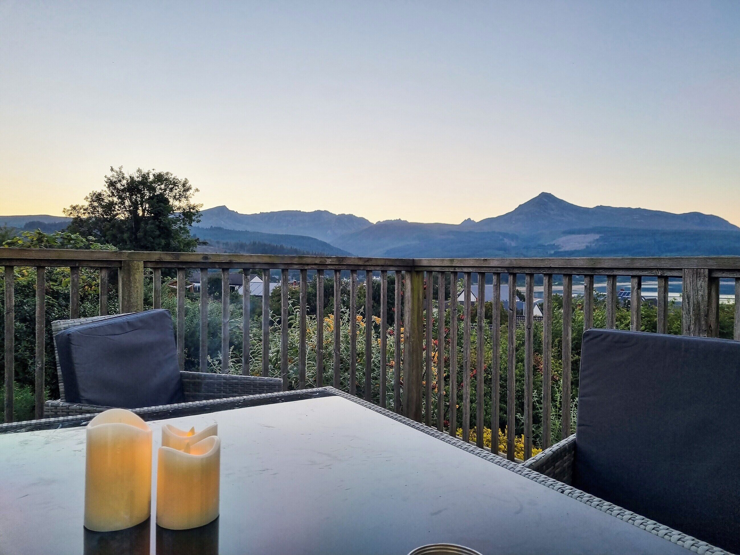 The kitchen/diner has a huge picture window overlooking the beech tree and burn which runs along the side of the garden. In the winter with the leaves off the tree you can sit on the window seats and soak up the stunning view of Holy Isle which are revealed. If that view is not enough all the rooms have windows which face the bay maximising the view and the sunrise. Also giving a prime location to watch the varied ships and naval excersises on the Clyde. The lounge has two sofas and woodburning stove with a 40 inch smart TV. Delightfully appealing and beautifully situated there is a lovely patio at the back which is an e perfect sun trap, surrounding the patio the extensively planted garden bursts with colour.