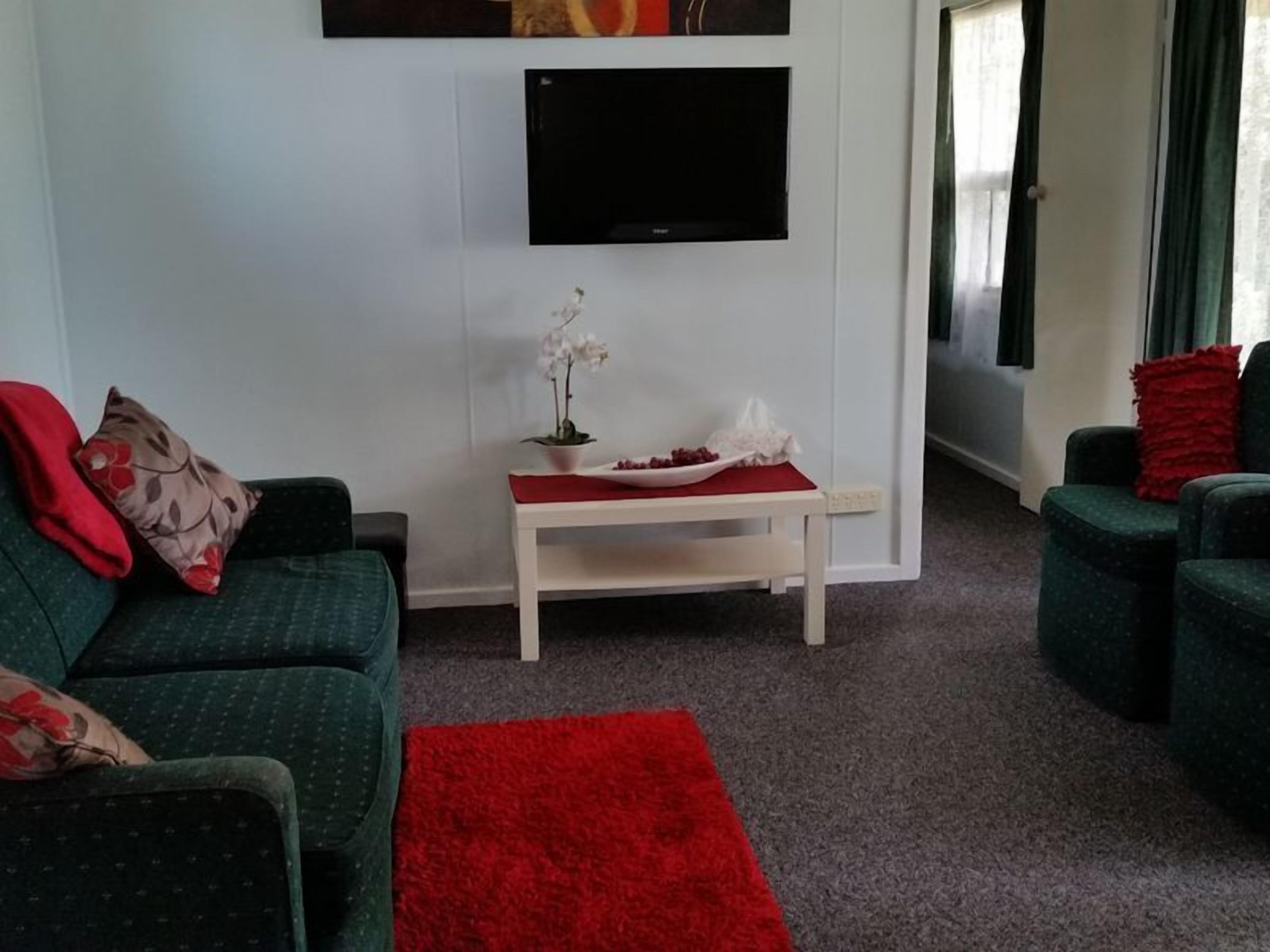 The cabin comprises a large well equipped country kitchen and living area, three bedrooms (one with a double bed and trundle, the other with a queen-sized bed, ensuite and ante-room), and a sleepout with a single bed and double bunk.
