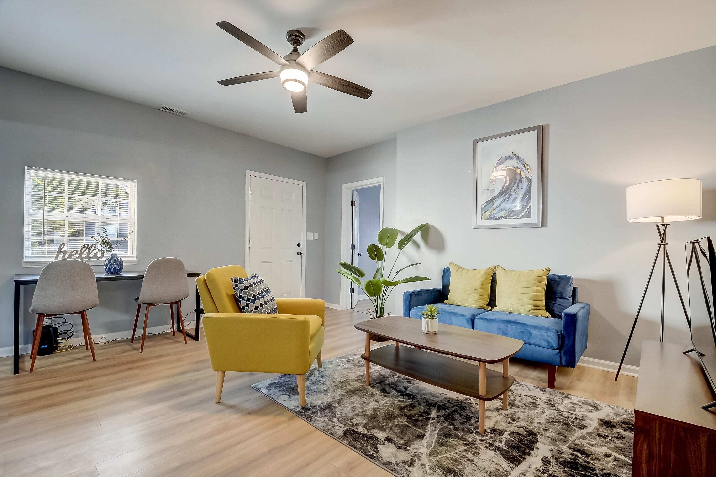 Joplin was decorated with Janis in mind. Color palate, accents, and decor was considered throughout. The cottage is small but cozy. The living area was opened up to provide a larger space to collectively come together. Both bedrooms have smart television in case someone in the group needs to break away and watch something on their own.