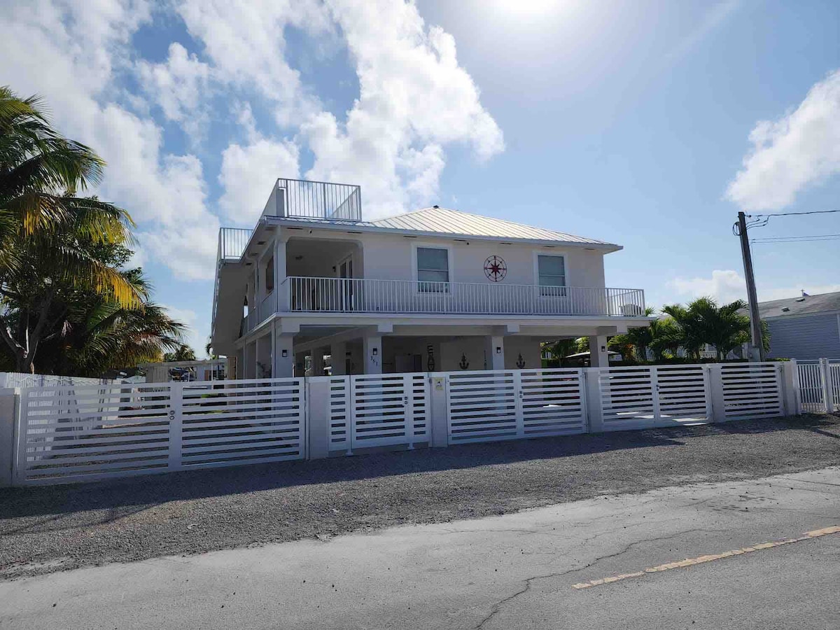 Raised waterfront home at the start of the Florida Keys (Mile Marker 112) with 200 ft of waterfront, all around water views, on canal, access to Barnes Sound/Manatee Bay. New Docks & TidalFit Heated Exercise Pool/Spa. Easy access from Miami International Airport and minutes away from restaurants and outdoor entertainment in Key Largo — the perfect spot to get away from it all!