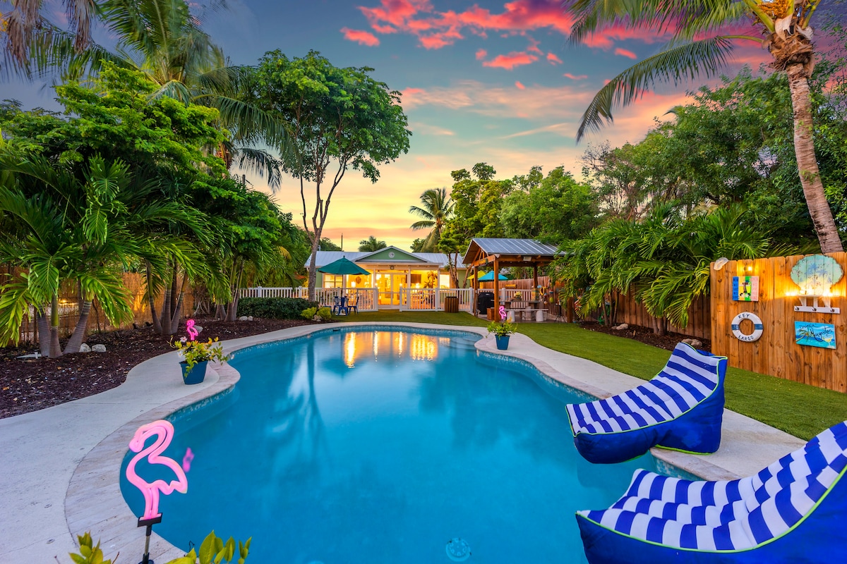 You can enjoy kayaking (4 kayaks provided) through the mangroves, watch the dolphins perform at the dolphin center around the corner, swim and sunbath in the free-form pool, play volleyball, corn hole and horse shoes at the backyard beach, fish from the dock, or enjoy an afternoon practicing your golf swing at the private 75-yard pitch/putt greens located on premise. Use the bikes to exercise checking out the area or spend the evening barbecuing under the chickee hut and then enjoy a night cap by roasting marshmallows at the fire pit by the ocean.