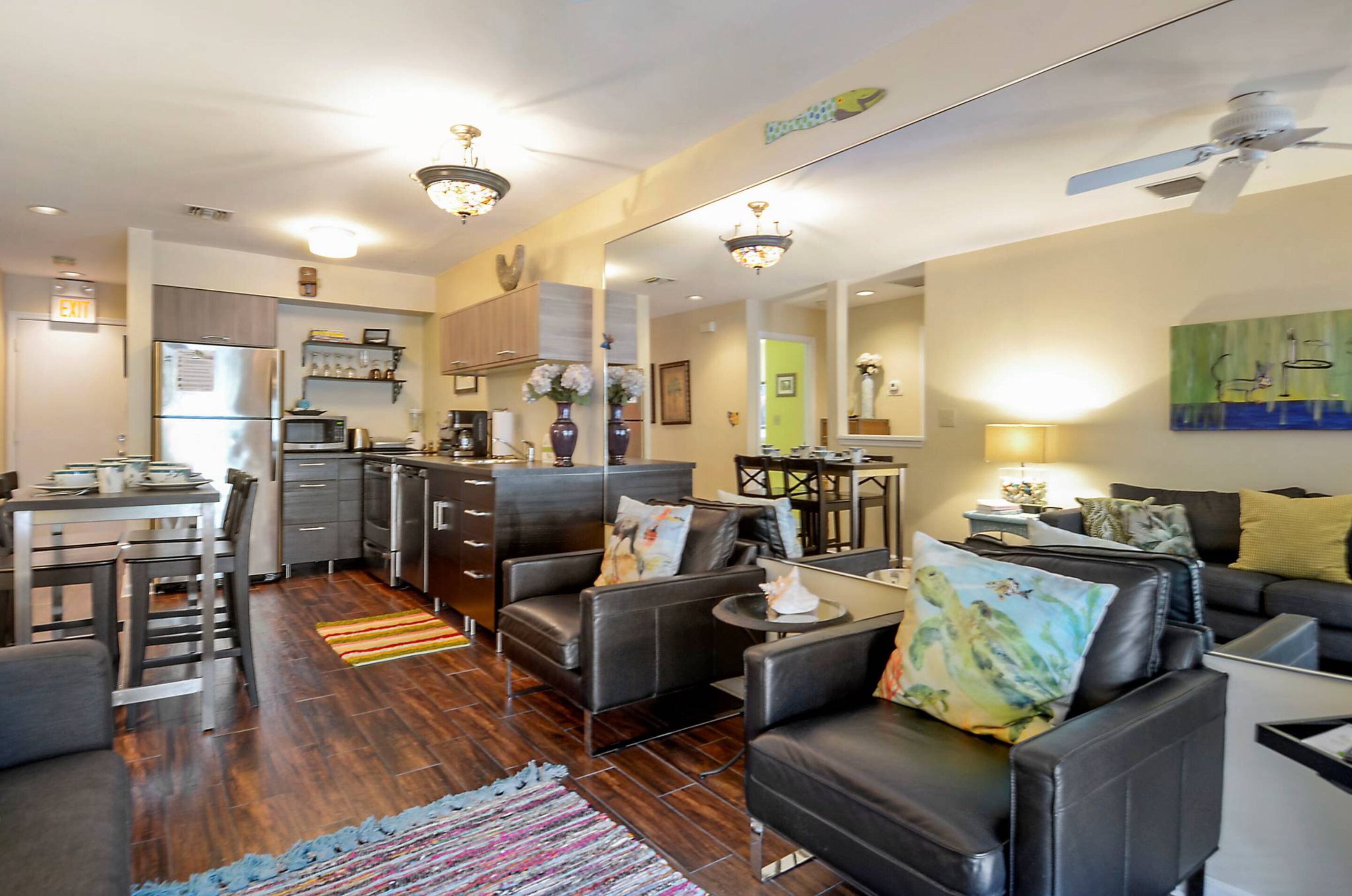 The bright, contemporary living space has polished, rich wood flooring, which imbues a warm island vibe. The driftwood gray interior pops with accents of white and cream. Relax on the plush sofa or armchairs to socialize, read, or stream your favorite shows on the wall-mounted SmartTV with Roku. Stylish coffee tables, lamps, a ceiling fan, and large windows enhance the space. This living space has French doors, which open to a private deck with alfresco dining.