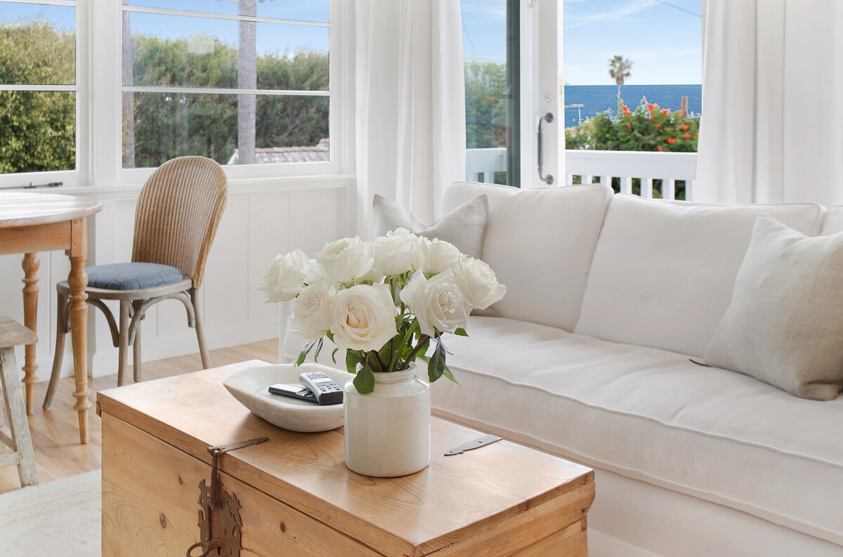Besides our sandy beaches you can tour Disneyland and Legoland, we are located between the two. After a long day put the exhausted kiddos to bed and have after-hour cocktails on our deck, enjoy our smart TV in the comfortable living room, or relax in our cozy romantic master bedrm. This 1930s cottage is tastefully furnished in coastal appropriate appointments, no “thrift shop or garage sale finds”, with panoramic ocean views on prestigious Cliff Drive. One king bedroom with 100% cotton linens, full bath, granite kitchen with all the amenities, and original preserved beautiful trestle beams and hardwood floors throughout. Grand living room with trundle twin beds suitable for minors, Primary bedroom, living room plus personal deck overlook the ocean. All linens provided and professionally laundered. We have great WIFI. We provide beach chairs, towels and beach umbrellas.