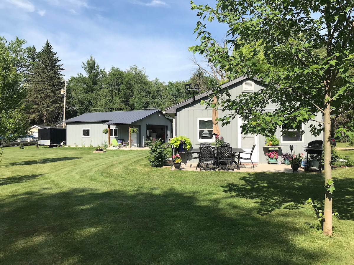 Book this cottage and enjoy the vintage and homey feel just minutes from downtown Lake Geneva! Traditional wood floors, unique antiques and lodge furnishings add to the charm of this 2 bedroom, 1 bath cottage. It is nestled on a quiet residential street with a deck with Adirondack chairs for your morning coffee, large yard, fire pit and place to park a boat! The kids can walk to the end of the street and play at the school playground on weekends, head down to the lake to fish or hang out in the basement and play some pool or air hockey.