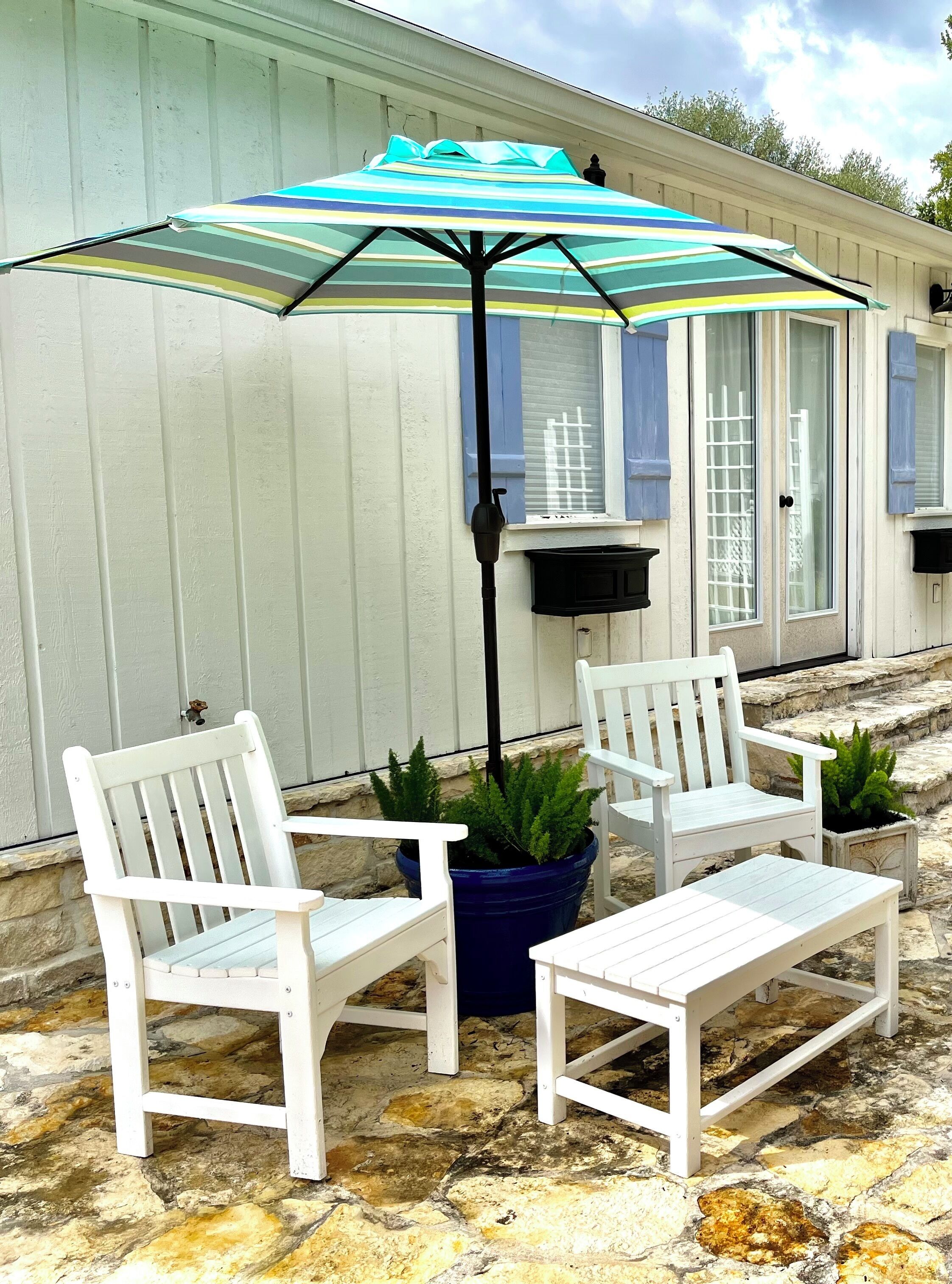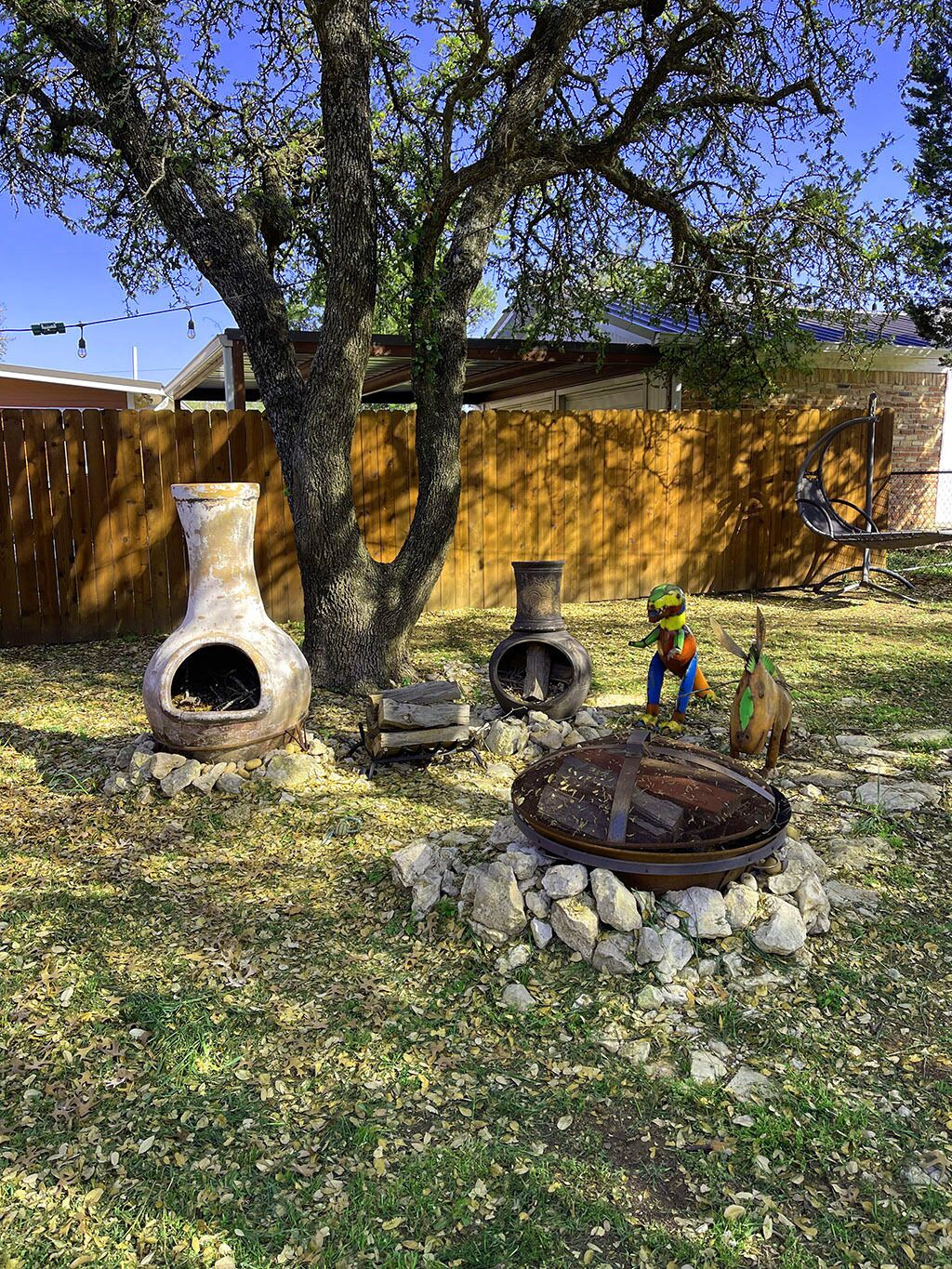 Outdoors, you're welcome to explore ten private acres of Texas countryside with majestic sprawling oak, elm and cedar trees where deer wander freely and birds love to nest. Dine or relax on the broad, flagstone patio. When weather permits, we often build a bonfire (by request) in the huge stone firepit for our guests during fall and winter.