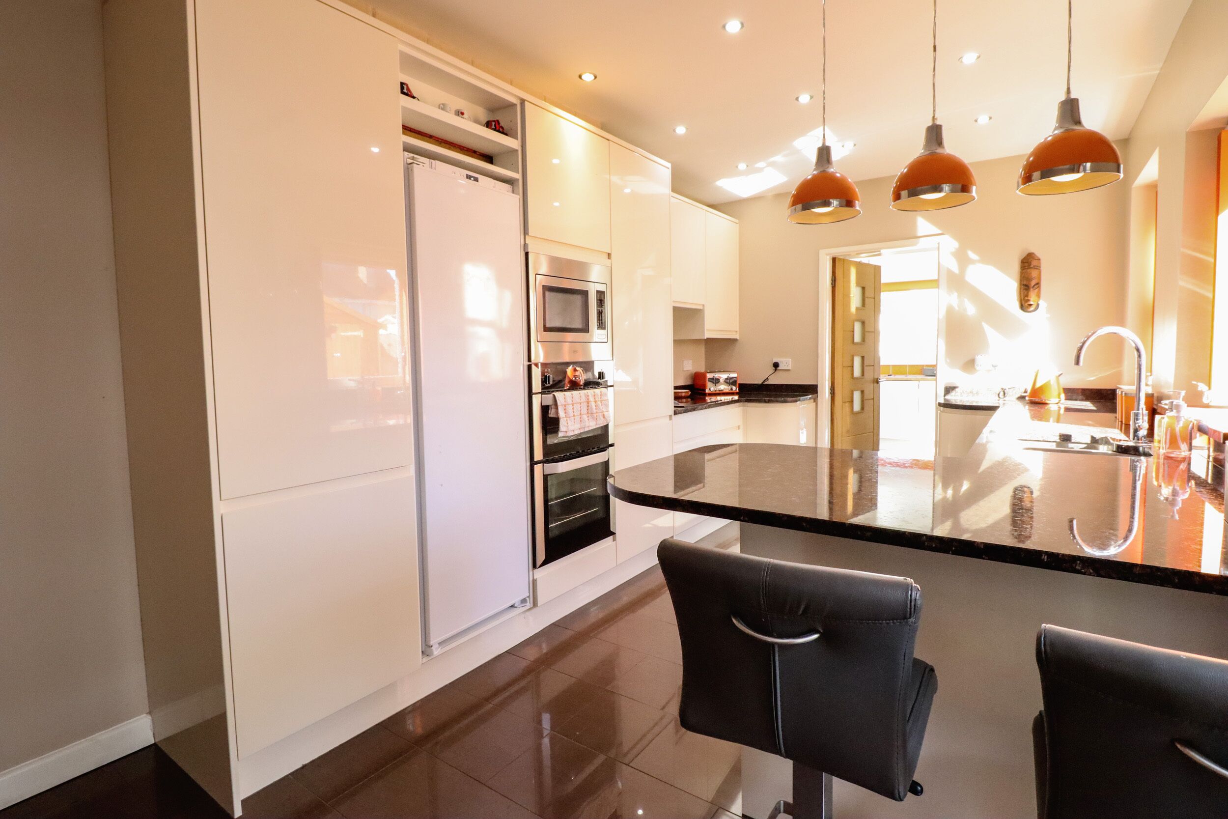 The beautiful living room has a large 3 seater leather sofa, smart TV with Netflix and WiFi enabled. A decadent armchair completes the picture. The stunning feature fireplace is NOT functional for real fires, a gas central heating system supplies ample heat. The bright sunny conservatory on the front aspect benefits from a comfortable rattan sofa and stunning glass topped, teak root table and leather chairs. The fully equipped kitchen features a rangemaster stove (gas hob/electric double oven) together with fitted fridge and freezer and is situated on the rear elevation, a separate Utility room houses a newly fitted gas boiler, washer/dryer and dishwasher. Also a cloaks cupboard for coats and shoes. A door leads from here into the downstairs wet room, which has a very large showering area with hand held, overhead and body spray jets. A vanity unity with useful under storage and tall chrome ladder radiator.