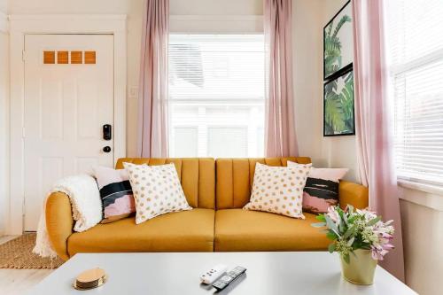 This 1920s cottage style home has 2 bedrooms and 1 bathroom. The kitchen comes with everything you need to cook your meals and make your morning coffee! Located in the kitchen is also a washer & dryer. The bathroom is stocked with all essentials including shampoo, conditioner, body wash, hairdryer and curling iron. The living room has two stylish papasan chairs and a day sofa (day sofa can sleep one person). Relax and watch something on the smart tv or enjoy a game of Jenga! The first bedroom has a queen bed, roku tv, dresser and closet. The second bedroom has a full size bed and a roku tv with a closet attached. In the closet attached to bathroom and the second room there are extra towels and linens, beach chairs, towels, toys and umbrella. If you are traveling with an infant or child, there is a high chair, baby bath, outlet covers and a pack n play/travel crib stored in the closet of the first room.