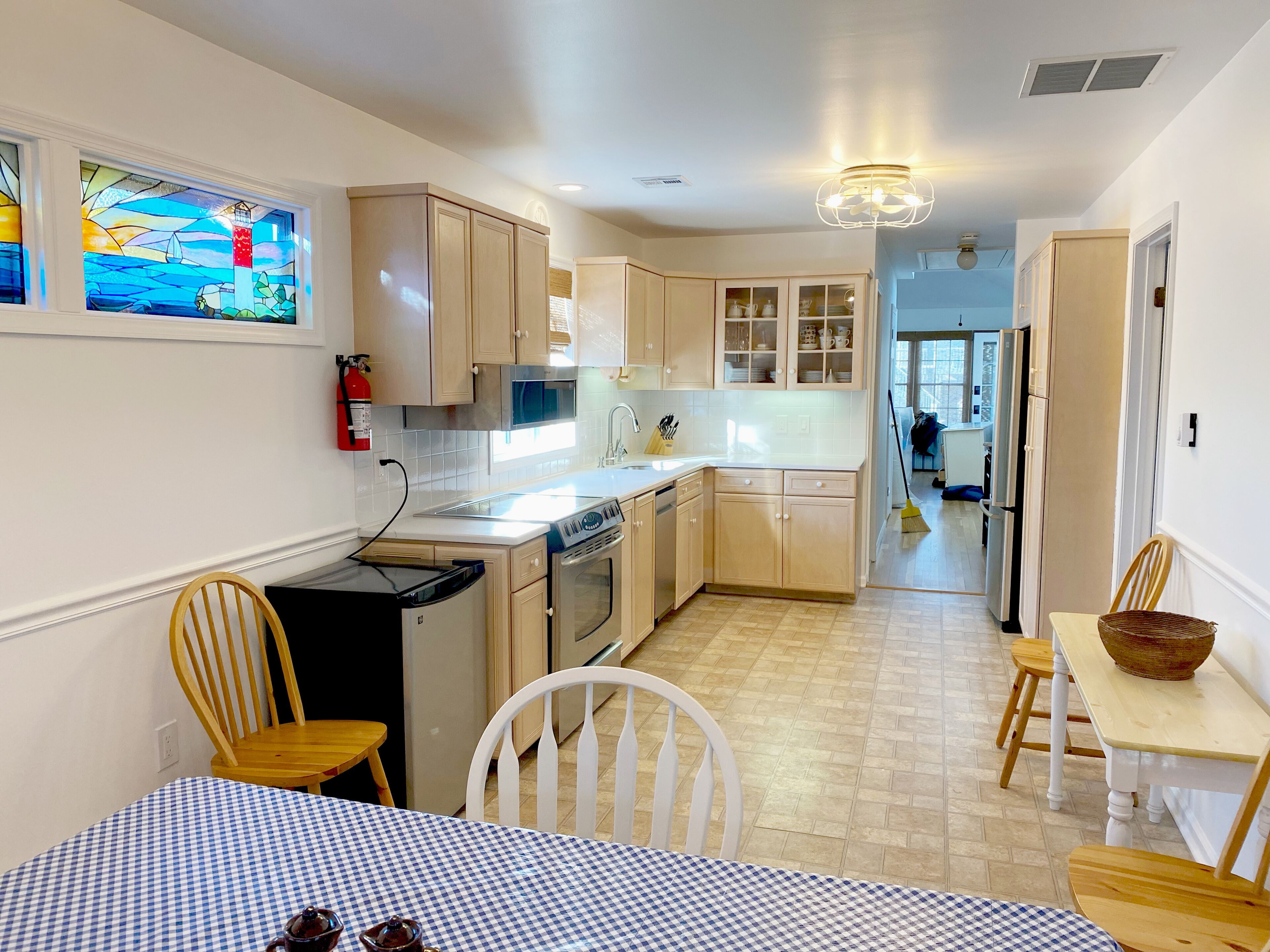 Up the narrow staircase is the second floor, an open room lined with windows. In the benches by the card table you'll find board games and craft supplies for kids. On rainy days, stretch out on one of the daybeds with a book, or watch a movie (there's an old-school DVD player and a good selection of family-friendly movies, or you can use Netflix, Amazon or Hulu on the smart TV).