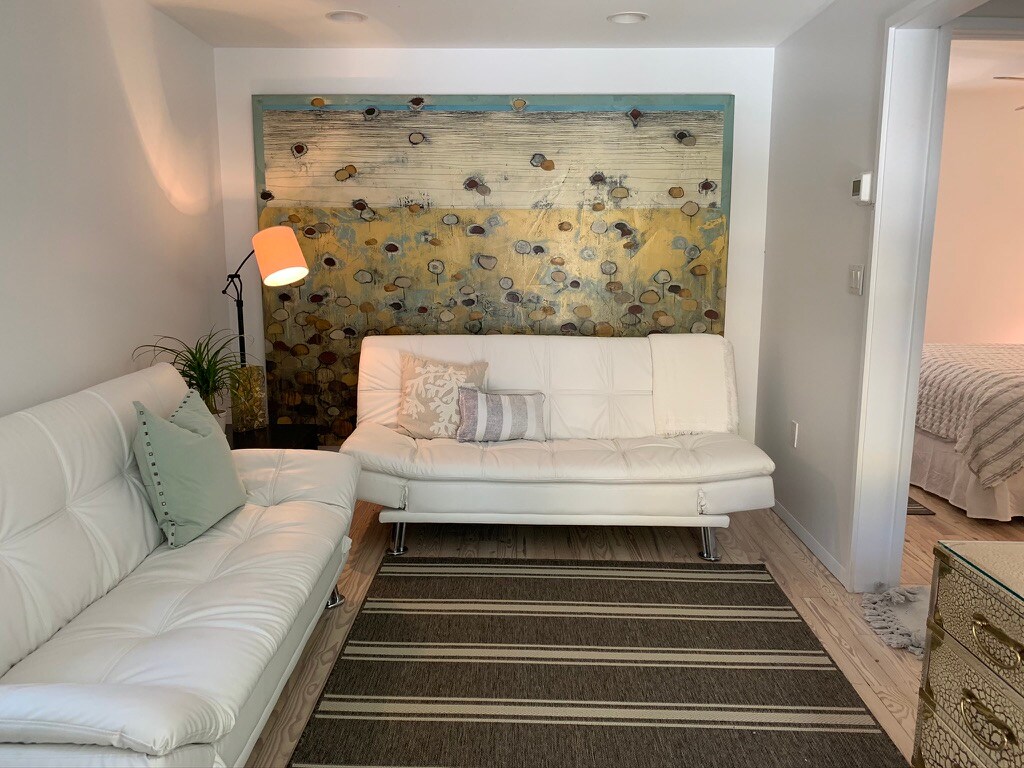 Spacious & Modern: Relax in a large living room with a queen sofa bed, perfect for lounging after a day at the beach.