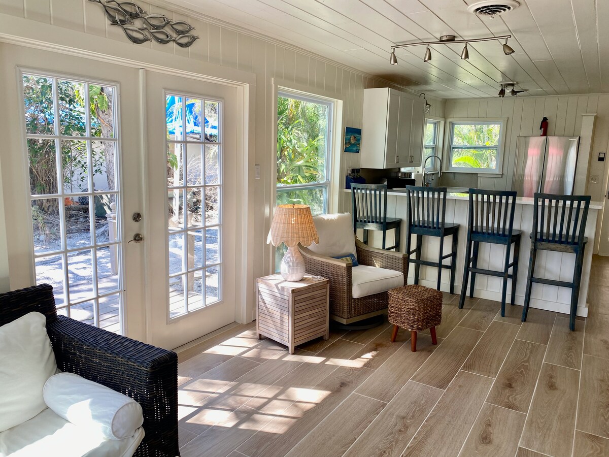 The Bikini Top Cottage sweet spot for couples. Tiny Home in a Cozy Island village. The bungalow is on an alley way that leads directly to the kayak, boat launch, and restaurants. Walk down to view the sunrise coffee in hand with the Sailboat moorings and end your day at The Mar Vista restaurant. Make sure you walk out on the dock and look in the water around the sunken lights.