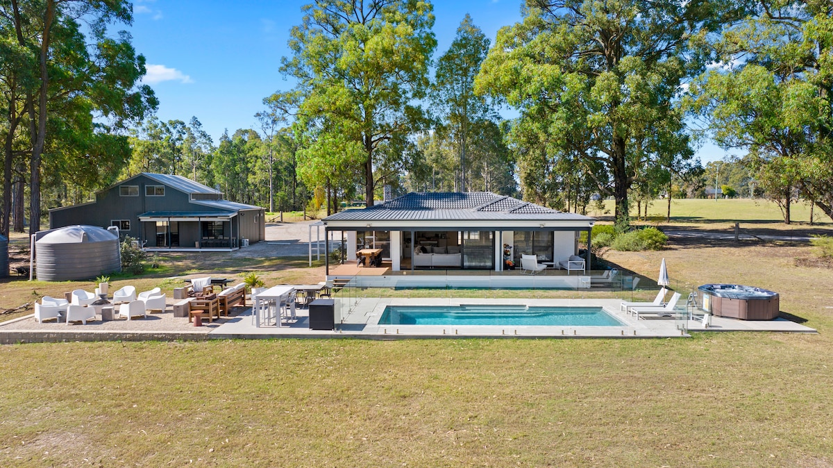 Lovedale Abode provides a great escape into nature with the luxuries of heated swimming pool with beautiful vistas, hot tub, playground, trampoline, basketball court nestled amongst grand trees, soccer field, Volleyball, outdoor entertaining areas, and a cozy fire pit for the cold valley nights.