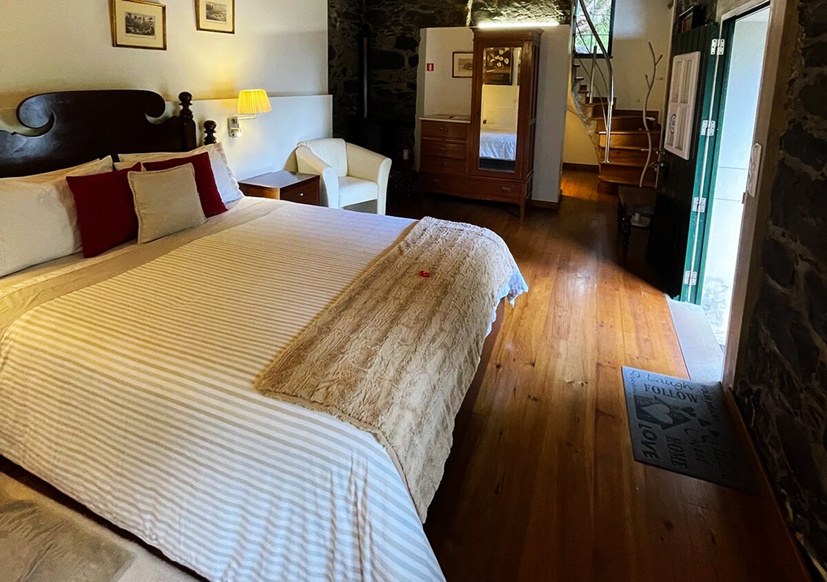 Casa do Feitor (Factor's House) has comfortable 1st floor accommodation with a large balcony, suitable for 2 guests. Accessed by an old stone staircase, the front door opens into a living room with sofa, 2 armchairs, a coffee table locally crafted from chestnut beams used in the Quinta, a desk, side tables, a TV with over 600 cable channels, including German satellite channels , broadband access and table lamps.