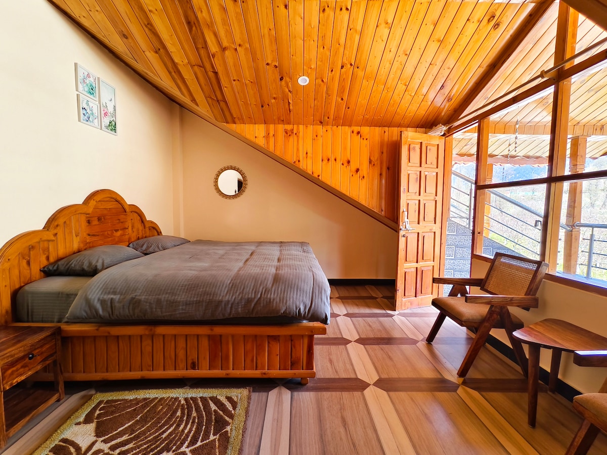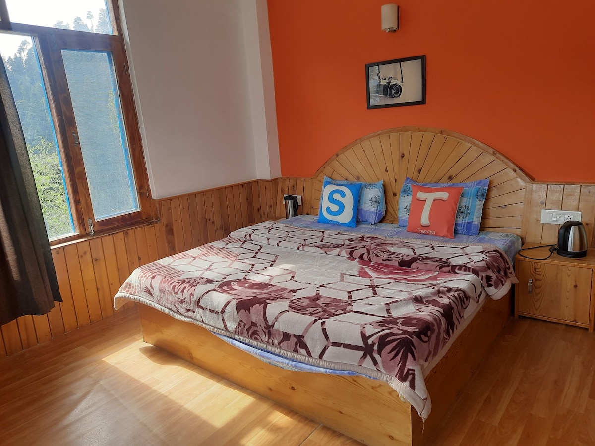 It is one of the 3 spacious bedrooms with attach bathroom. It includes free wifi and access to common kitchen . You can enjoy view of snow capped mountains and river beas from terrace.
