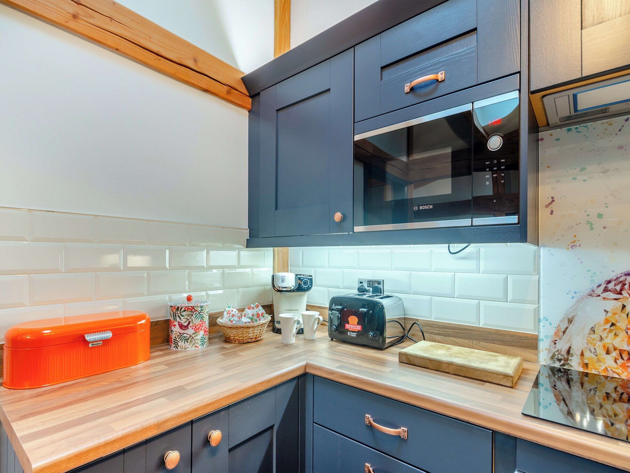 Through the sliding barn door into a high spec kitchen dining area. The kitchen is a wonderful space, and has plenty of utensils to make delicious meals using local ingredients. There are 2 butchers, greengrocers and a market on Wednesdays and Saturdays in the square. If you prefer to bring your own frozen food there is a freezer. The kitchen also includes a dishwasher, induction hob, microwave, oven, fridge, air-fryer, kettle and toaster.