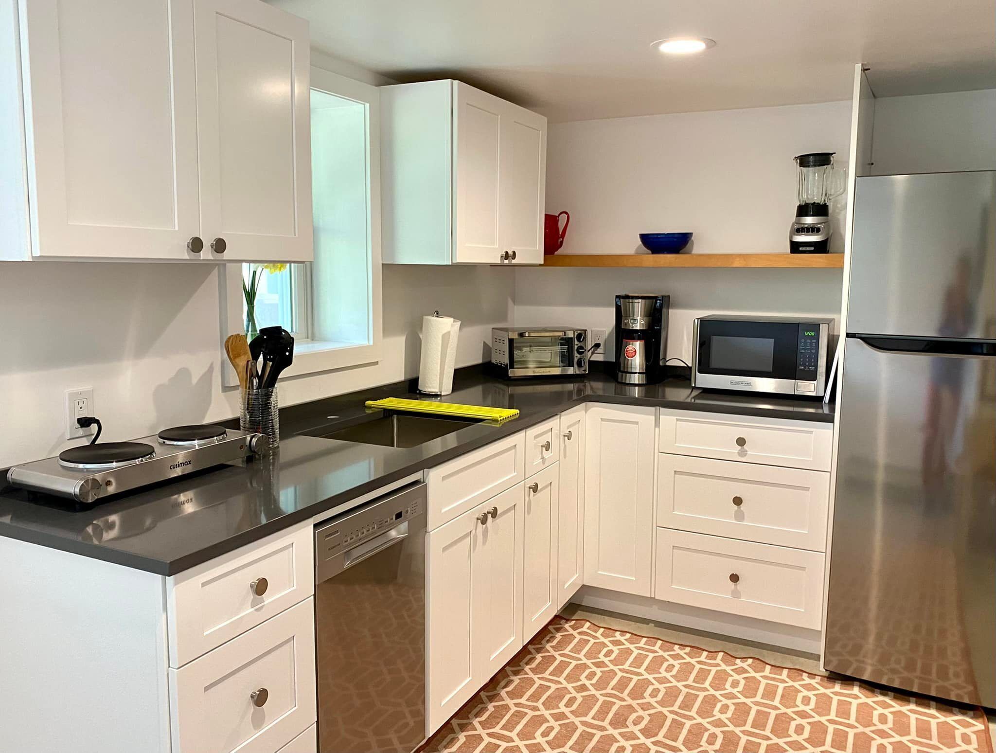 * Stocked kitchen with plenty of counter space, a sink, fridge with ice maker, microwave, dishwasher, a gas range with oven, almost everything you need to make great meals. The east end is abundant with fresh produce and seafood.