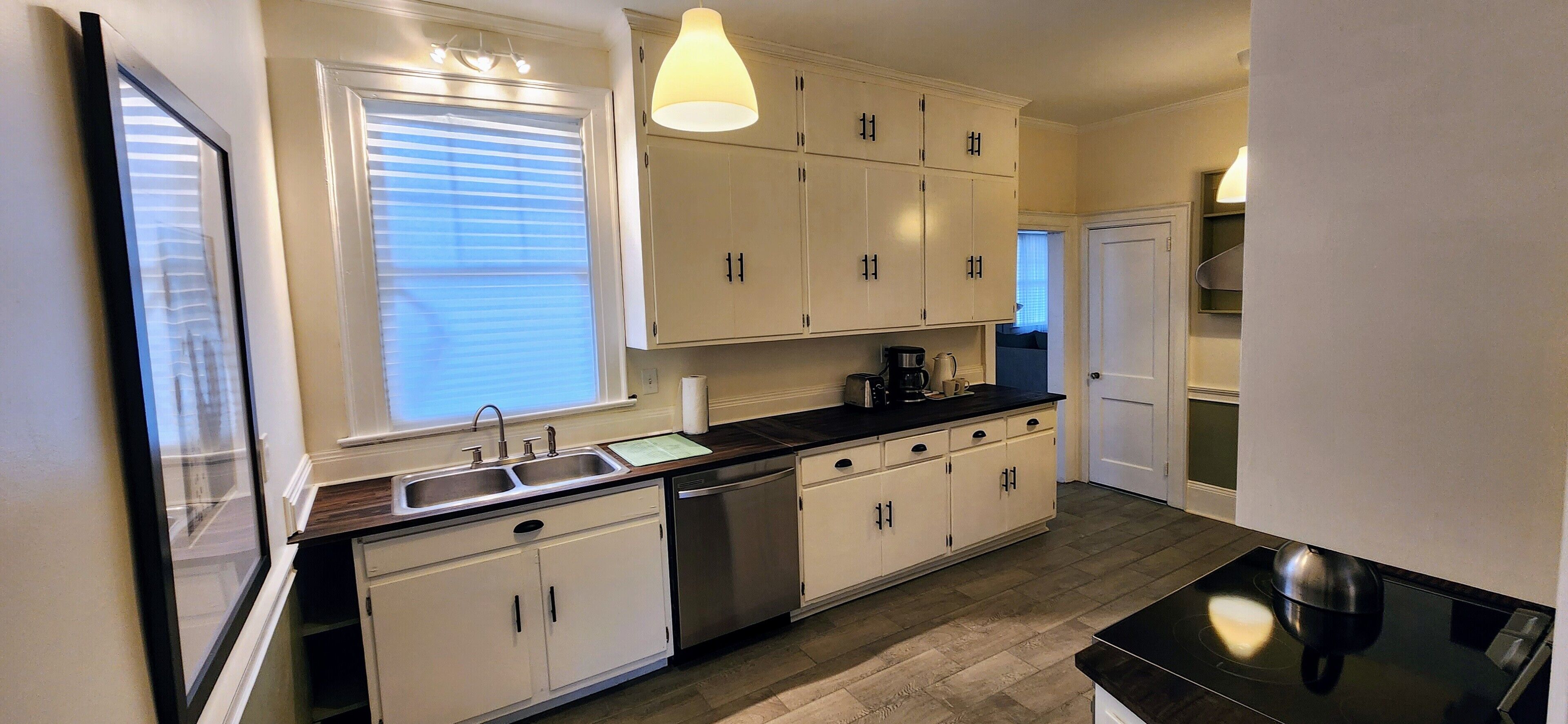 A quirky pocket door leads to a refreshing full bathroom with a shower and toilet. The home boasts of a fully equipped kitchen with all essential appliances and utensils. The mint kitchen also provides complimentary condiments.