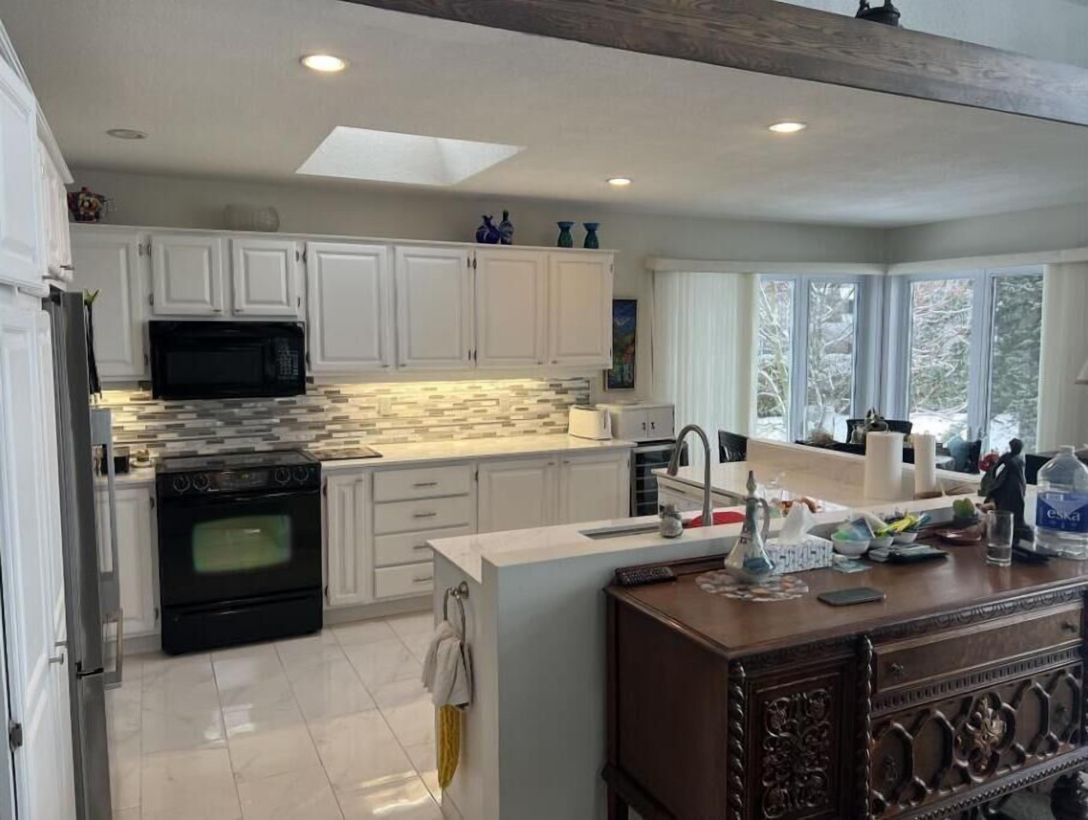 The spacious house contains rustic-style walls and a classic fireplace that adds warmth and elegance to the family room. The gourmet kitchen includes stainless steel appliances, sleek cabinetry, and a large center island that doubles as a breakfast bar. Quartz countertops and high-end fixtures complete the sophisticated aesthetic. Adjoining the living room is a spacious dining area, perfect for hosting intimate dinners or larger gatherings.