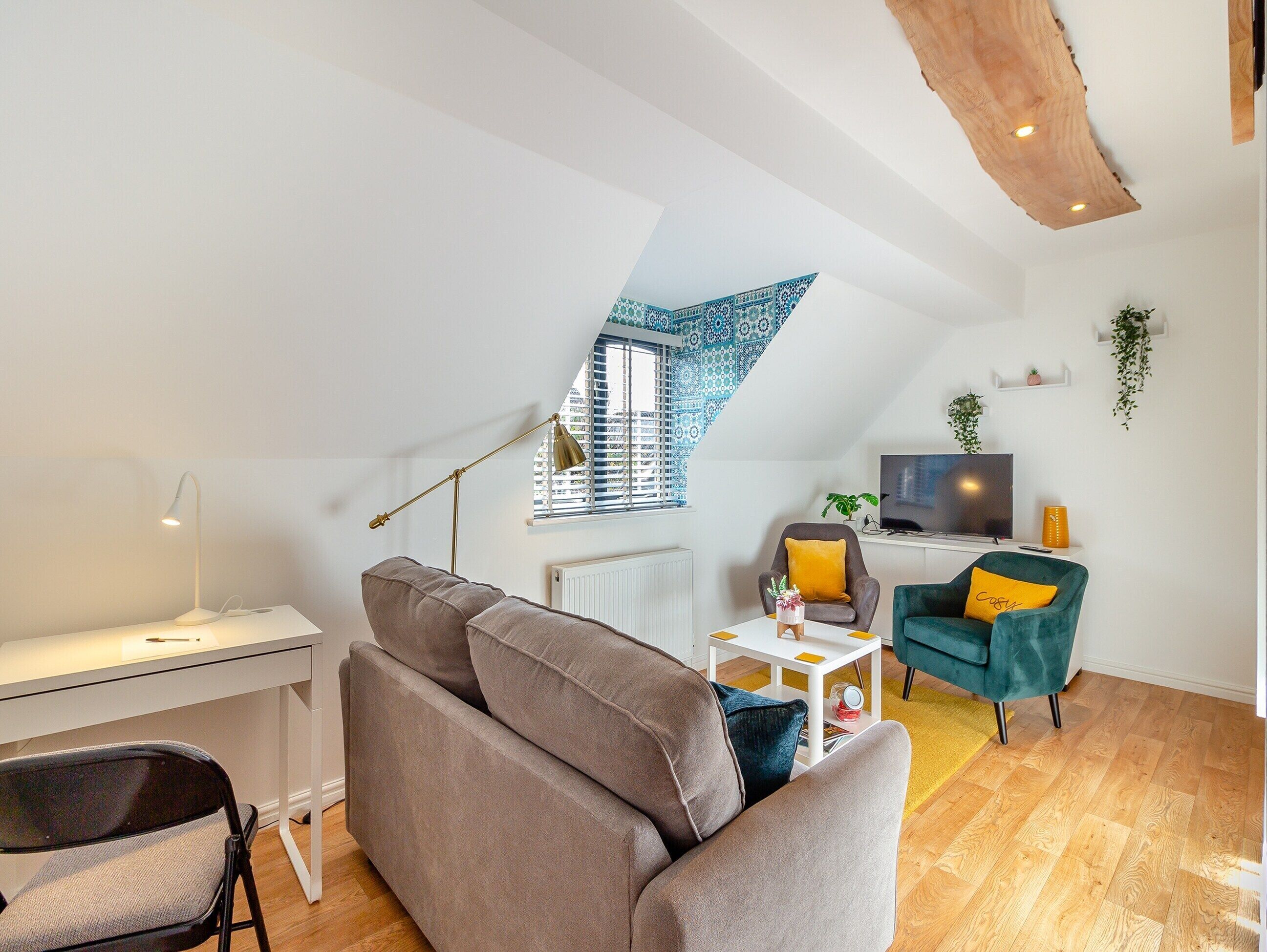 -- a cozy living room with flat-screen SMART TV and comfortable double sofa bed
