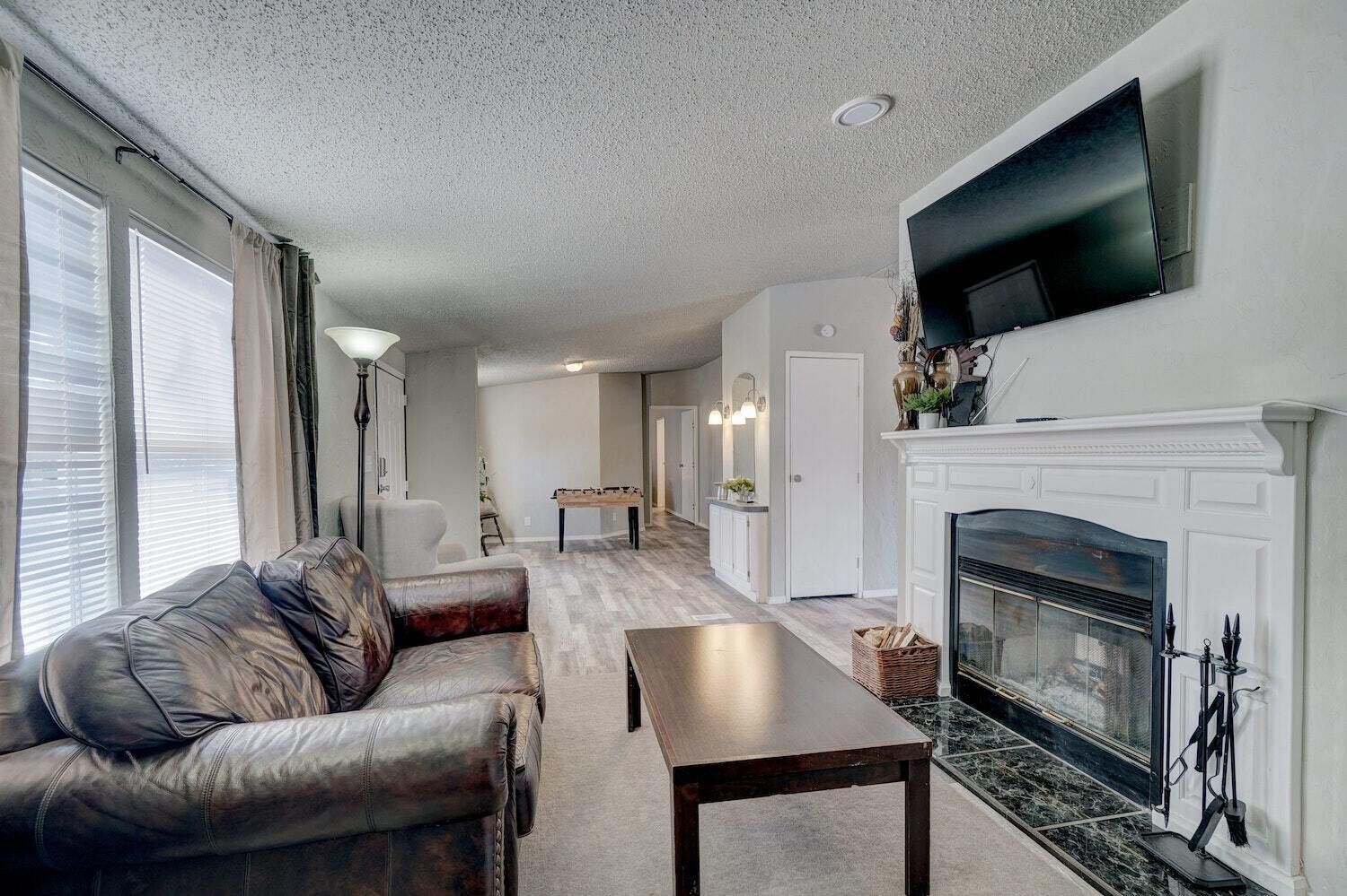 Fully equipped kitchen including a keurig coffee pot and pods; Dining room with table for 4; Living room has a brand new leather sofa plus 3 chairs, 60" smart TV; Spacious primary suite upstairs with queen bed on adjustable base, 35" TV, desk & comfortable leather office chair, walk in closet & full bath with shower; Guest bedroom downstairs with full size bed with heated mattress pad; Full bath with bathtub/shower; Laundry with washer/dryer including laundry soap, stain spray & dryer sheets; Outdoor patio sitting area with umbrella & patio lights.