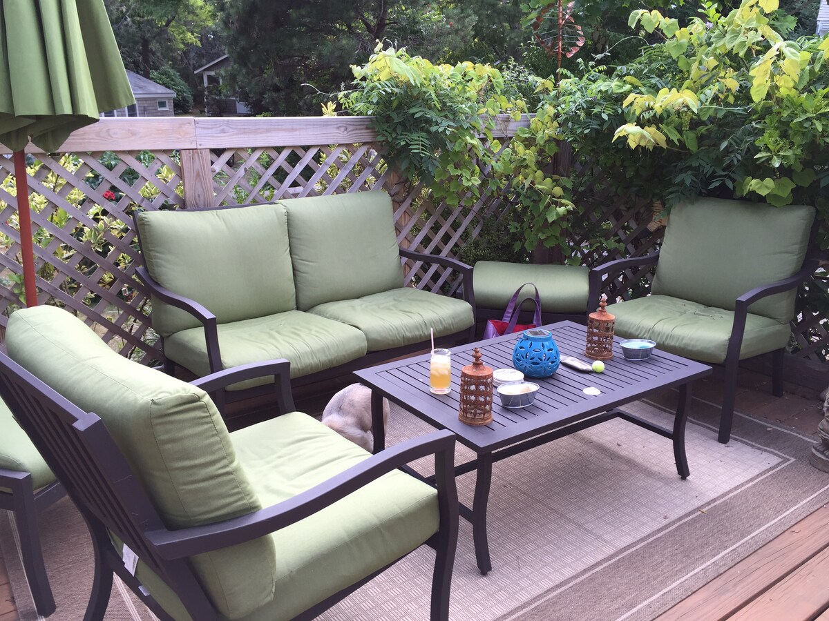 The outdoor patio becomes part of the living area of the cottage featuring a seating area, picnic table and outdoor charcoal grill.