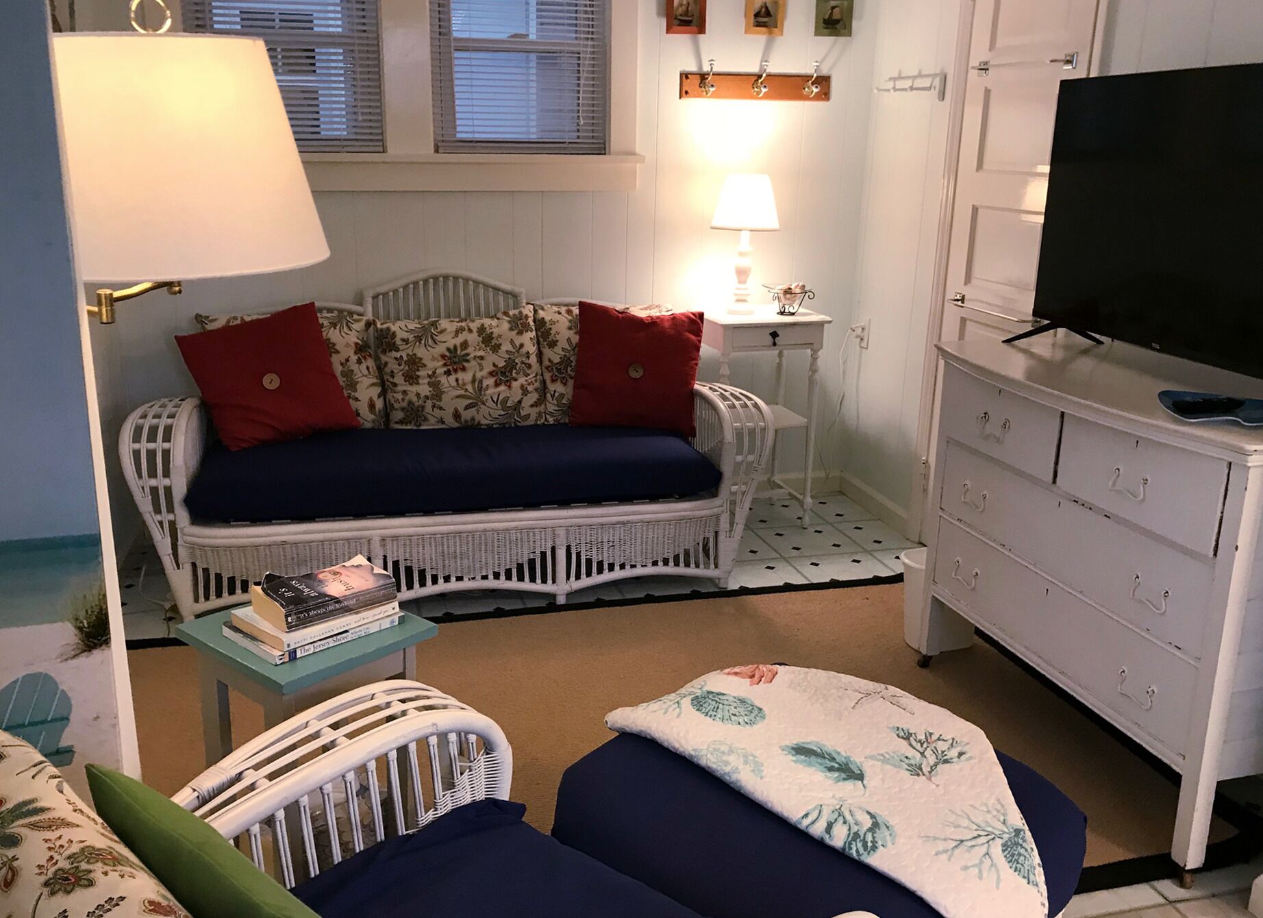 BED/BATH: The cottage has 3 bedrooms, one bathroom, and comfortably sleeps 6. On most evenings, the southerly breeze flowing through the house usually cools the day’s heat, but each bedroom does have its own window AC unit, as well as a wall unit in the living room. (There is also a ceiling fan in the living room, as well as in the middle bedroom). Each bedroom has a bureau, nightstand, and closet with hangers and hampers; we supply the bedspreads, pillows, mattress pads and blankets, but you will need to bring your own sheets, pillowcases and towels. If you need to run a quick load of laundry, there’s a washer and dryer just off the kitchen.