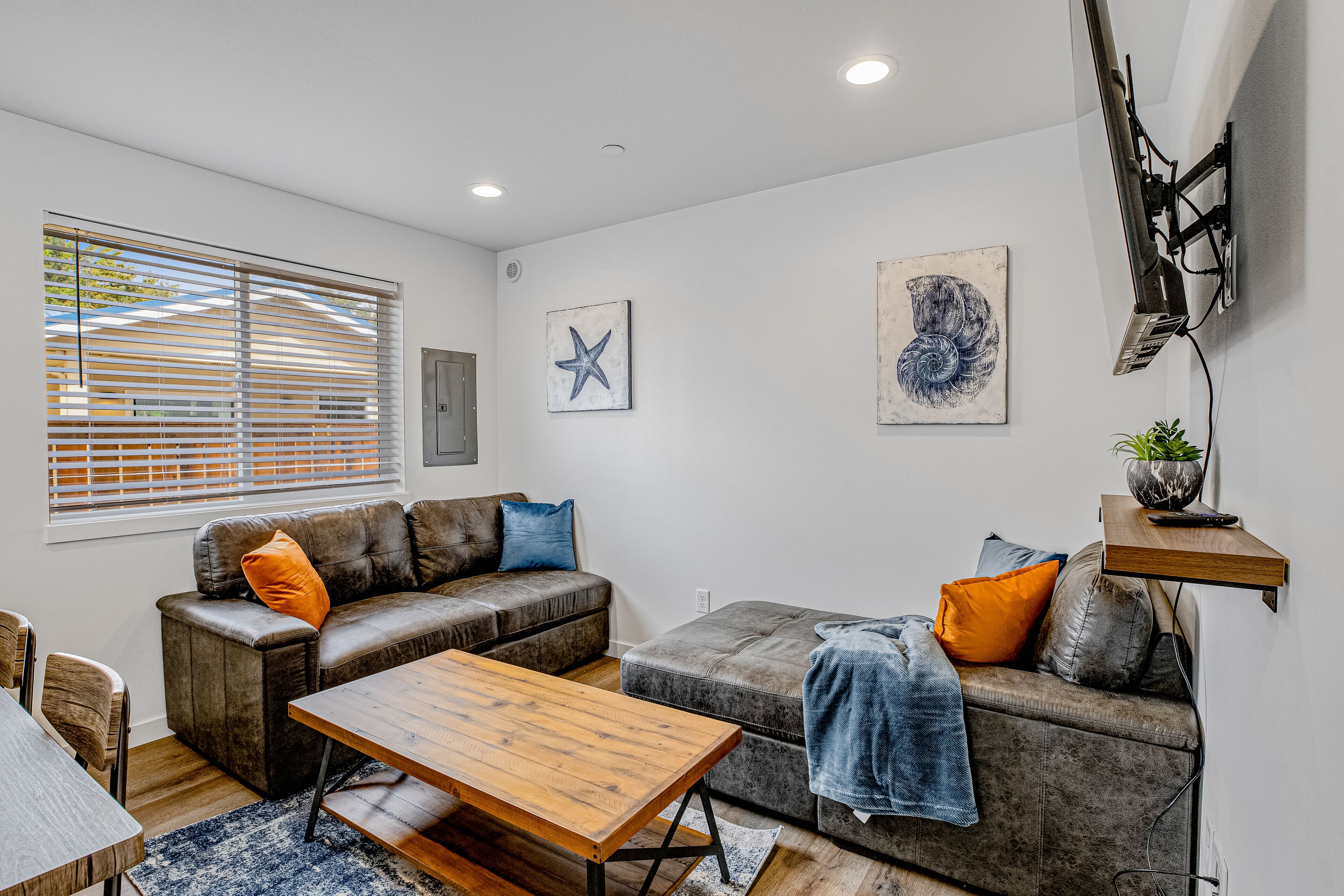 Enjoy your beach vacation at a beautiful newly constructed private home! Cozy and charming this place is perfect for family trips, romantic getaways and mini breaks from the big city's everyday life. With room up to 4, the space offers a queen size bed in the loft area and a convertible full size couch in the living room. Fully stocked kitchen has everything you might need for a perfect homemade meal. Of course, you could always head outside to enjoy an al-fresco meal on a spacious private patio with a dinning table and chairs for 2. Unwind with a cup of freshly made coffee and read a nice book outside or cozy up on a couch in front of a flat screen TV. Open concept floor plan allows for lots of natural light and feels airy and relaxing. With Mysa thermostats and a private washer/dryer combo unit this home feels modern and eclectic.