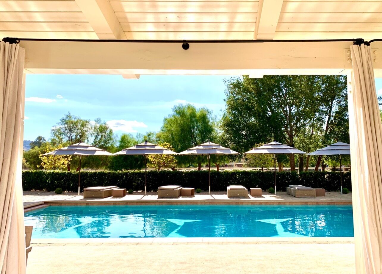 Beautiful seating and long tables under a private park of enormous sycamore shade trees, a bocce court, a solar heated swimming pool, chaise lounges and umbrellas, fire pit…all embraced by crisp privet hedges. At night the surrounding olive, sycamore and eastern redbud trees are tastefully lit, yet don’t compete with the sparkling vault of stars above.