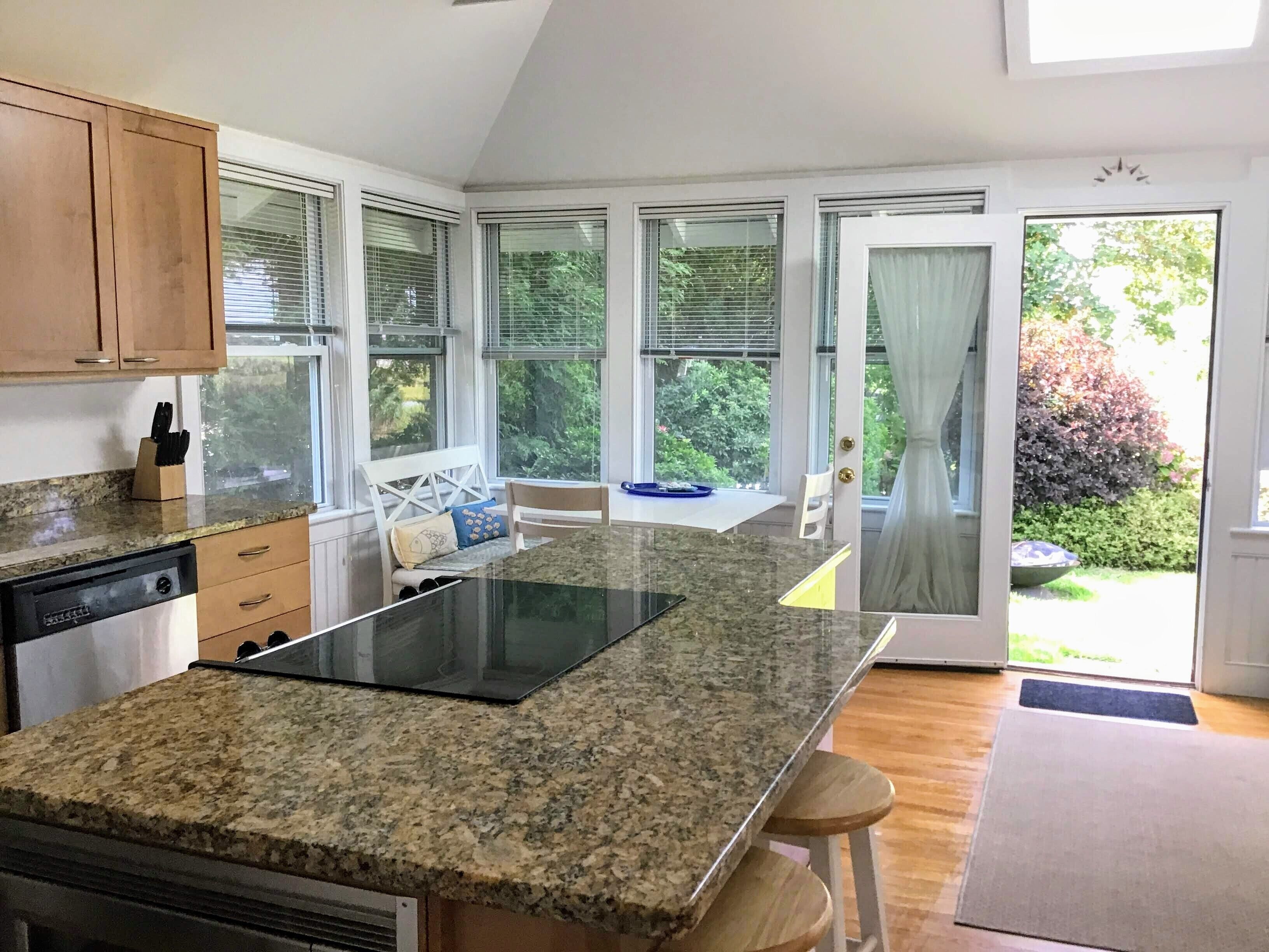The light filled and cheery cottage kitchen is equipped with all you need for your stay and has french doors that open onto the inviting screened porch for dining and relaxing.