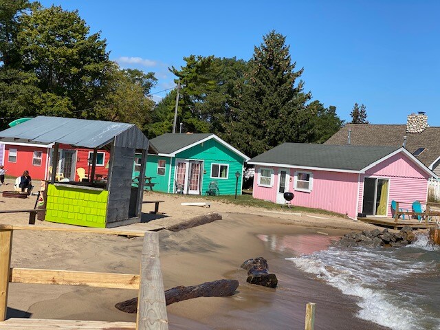 Cottage 1 Pink offers 2 bedrooms with 2 beds, 1 full bath, can sleep up to 6 with sofa sleeper. Fully equipped kitchen, open living area with french doors leading to private deck over looking Lake Huron. Closest to the water.