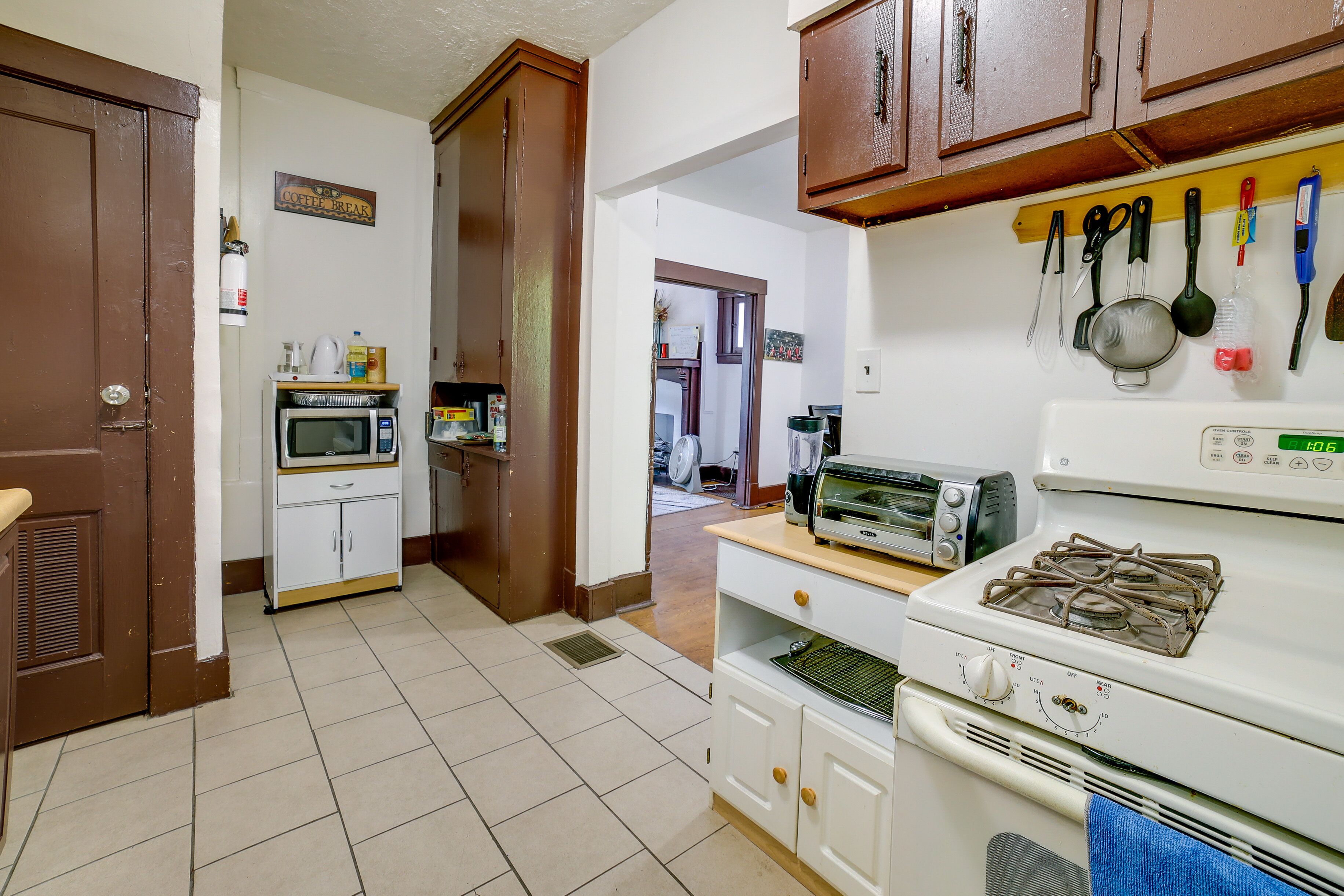 The kitchen is equipped with cookware and paper towels. Other amenities at this 4-bedroom, 2-bathroom rental include bed sheets, air conditioning, and heating.