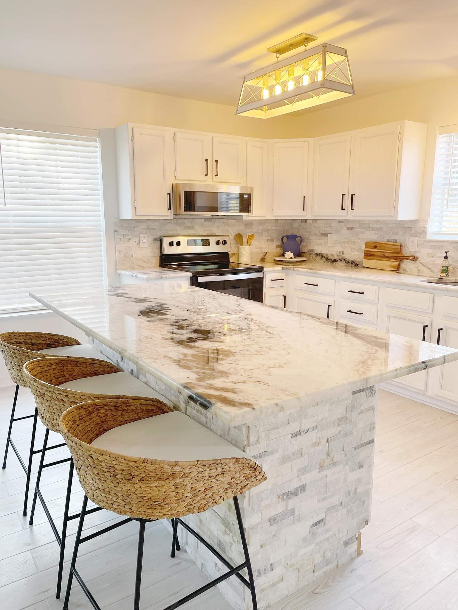 Step into luxury with a beautifully remodeled kitchen featuring a pantry, leathered granite countertops, new appliances, and tall cabinetry. The entire condo has been recently upgraded, boasting fresh paint, a new roof, doors, windows, flooring, and fixtures. The first floor is adorned with new furniture, including a queen pullout sofa, ensuring a comfortable stay for up to six guests.
