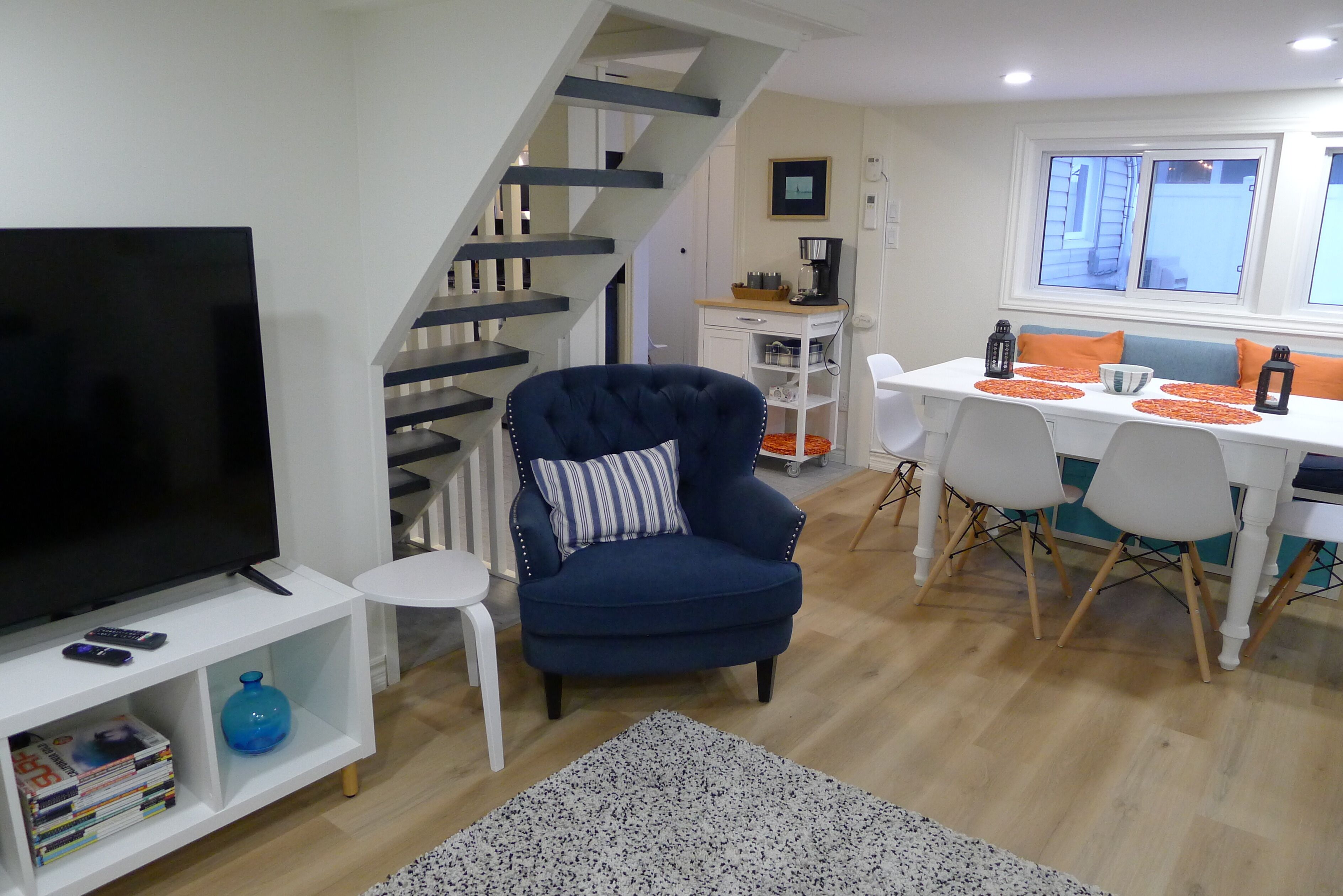 Our open concept main floor is home to our fully stocked kitchen and dining room with space to seat 6 guests along with our comfy living room equipped a pull out sofa and HD TV and Netflix ready TV.