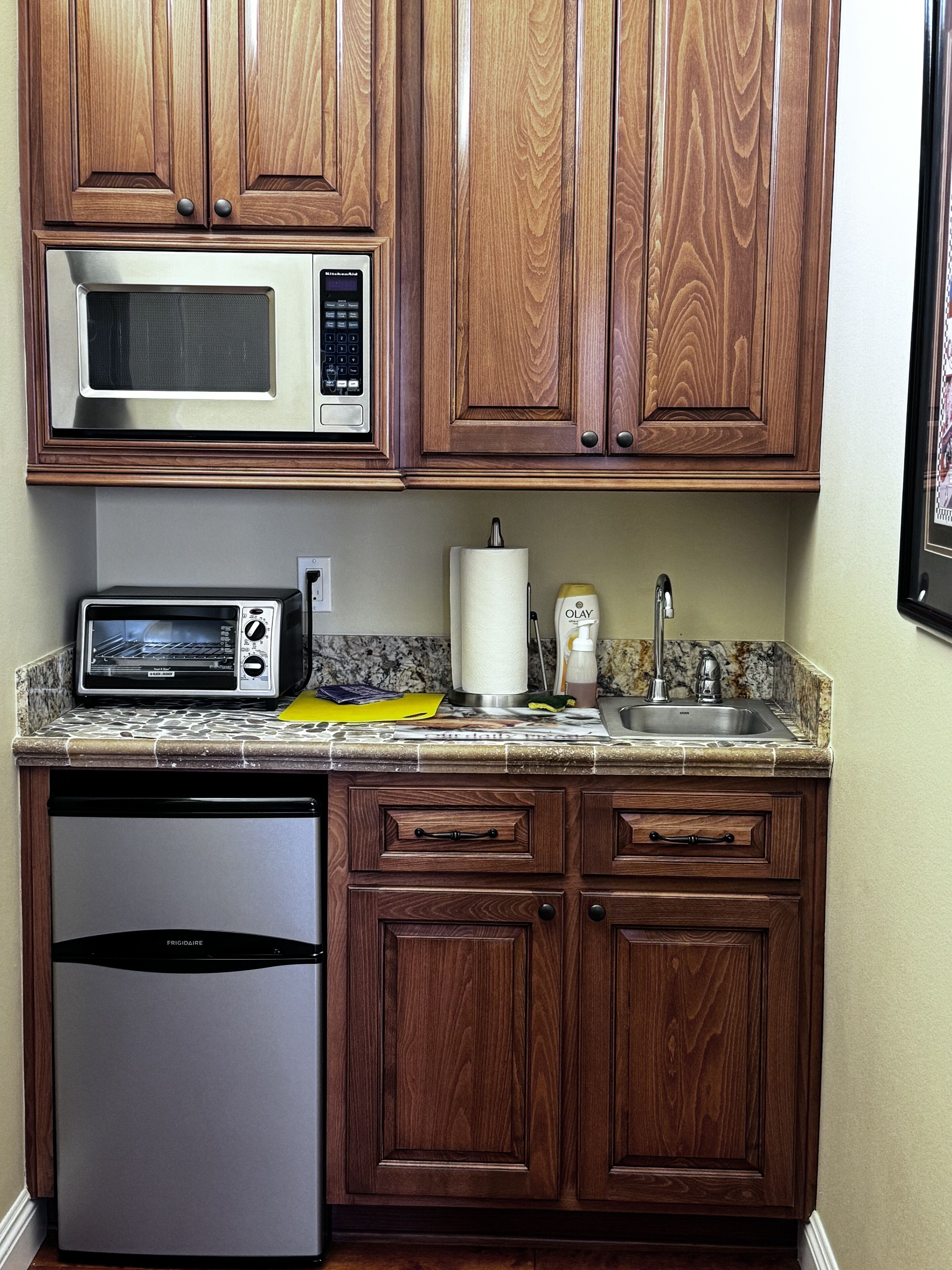 Recently completely renovated, the Cottage consists of three mains rooms: one large room which includes a queen-size bed, 2 seat recliner, 1 seat recliner, dresser, storage cabinet, desk, and TV. The second room is a fully-equipped kitchen (apartment sized refrigerator, propane stove/oven, dishes, utensils, pots/pans, etc.), and the third room is a full size bath/shower, fully equipped with towels, bath wash, shampoo & conditioner. There is also a small closet. (Please note that all amenities i.e. toilet paper, dish soap etc. are provided during the first day of your visit, which should be enough for at least 3 days. We have a Walgreens and Stater Brothers a couple miles south if you need extra items during your longer stay! ) Enjoy your own private, covered shaded deck, with seating, right outside the Studio Cottage French doors!