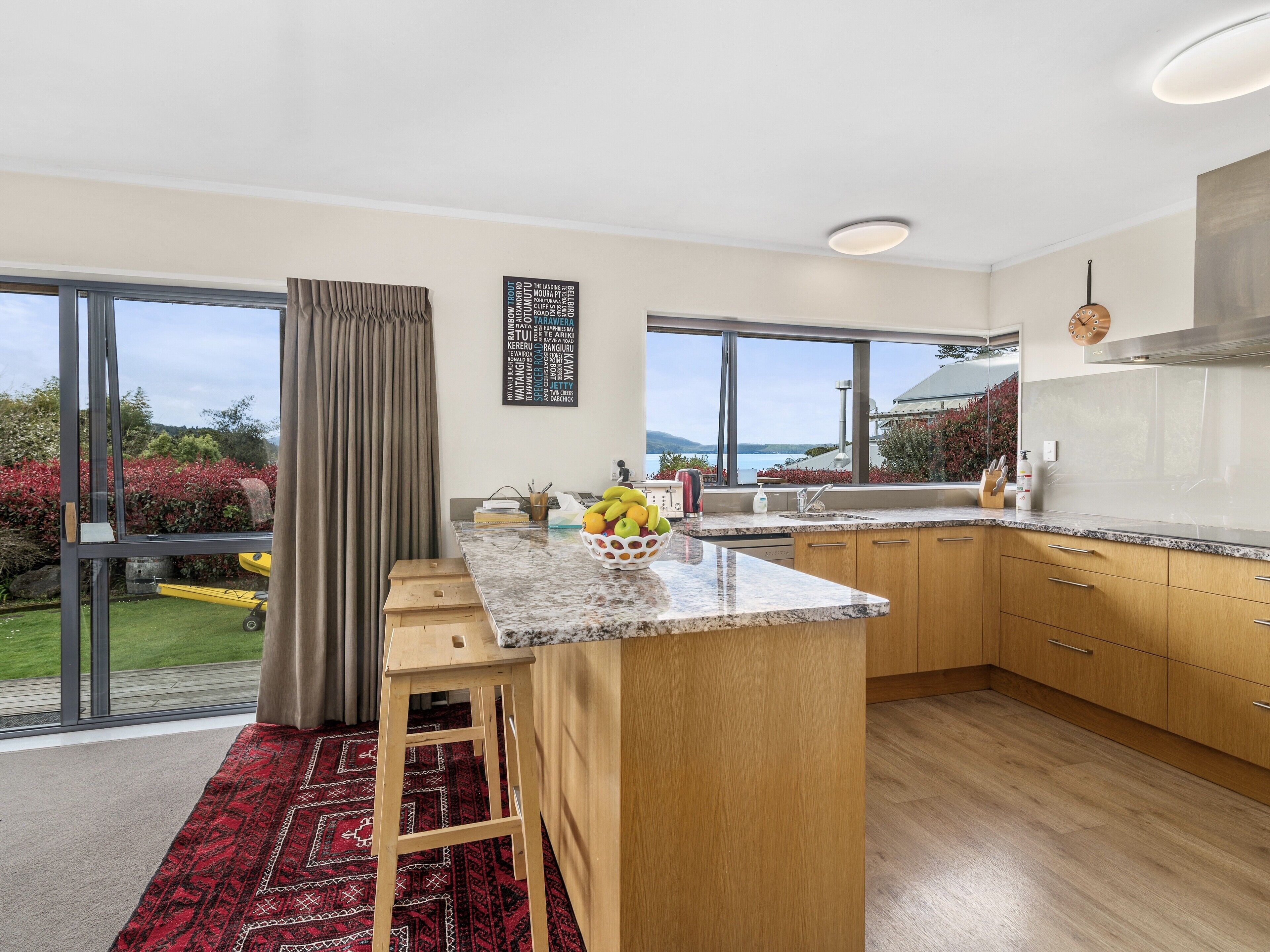 This house has been set up as a lakes holiday cottage with fireplace or heat pumps for cooler nights, modern kitchen with views to the lake while entertaining, large deck for entertaining indoor/outdoor living and all the appliances for longer stays such as washing machine, dryer, large fridge/freezer.