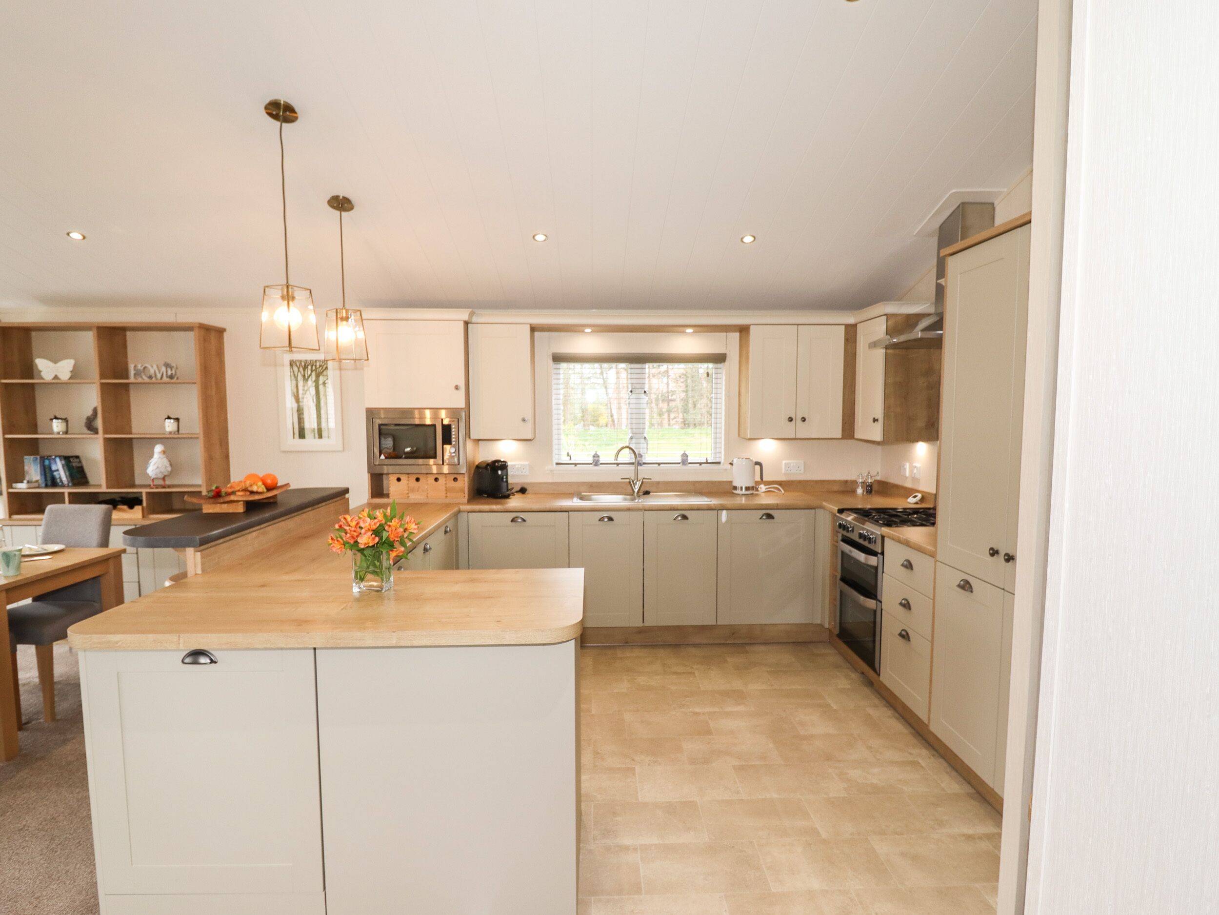 The living areas in this single-storey lodge consists of an open-plan living space with kitchen, dining area and sitting area with electric fire. Appliances include an electric oven and gas hob, microwave, fridge/freezer, dishwasher, and a Smart TV. The bedrooms consist of a king-size with en-suite basin and WC, and a twin, serviced by a shower room. Outside, there is an enclosed decking with furniture and hot tub, along with off-road parking for one car. Within 2 miles, you will find the nearest shop, and within 0.3 miles, a pub. Please note, this is a non-smoking property. Wi-Fi, fuel, power, bed linen, and towels are all included in the rent. Bring your loved ones for a memorable escape to Primrose Lodge. Note: There are steps leading up this property that may be unsuitable for those with mobility issues.
