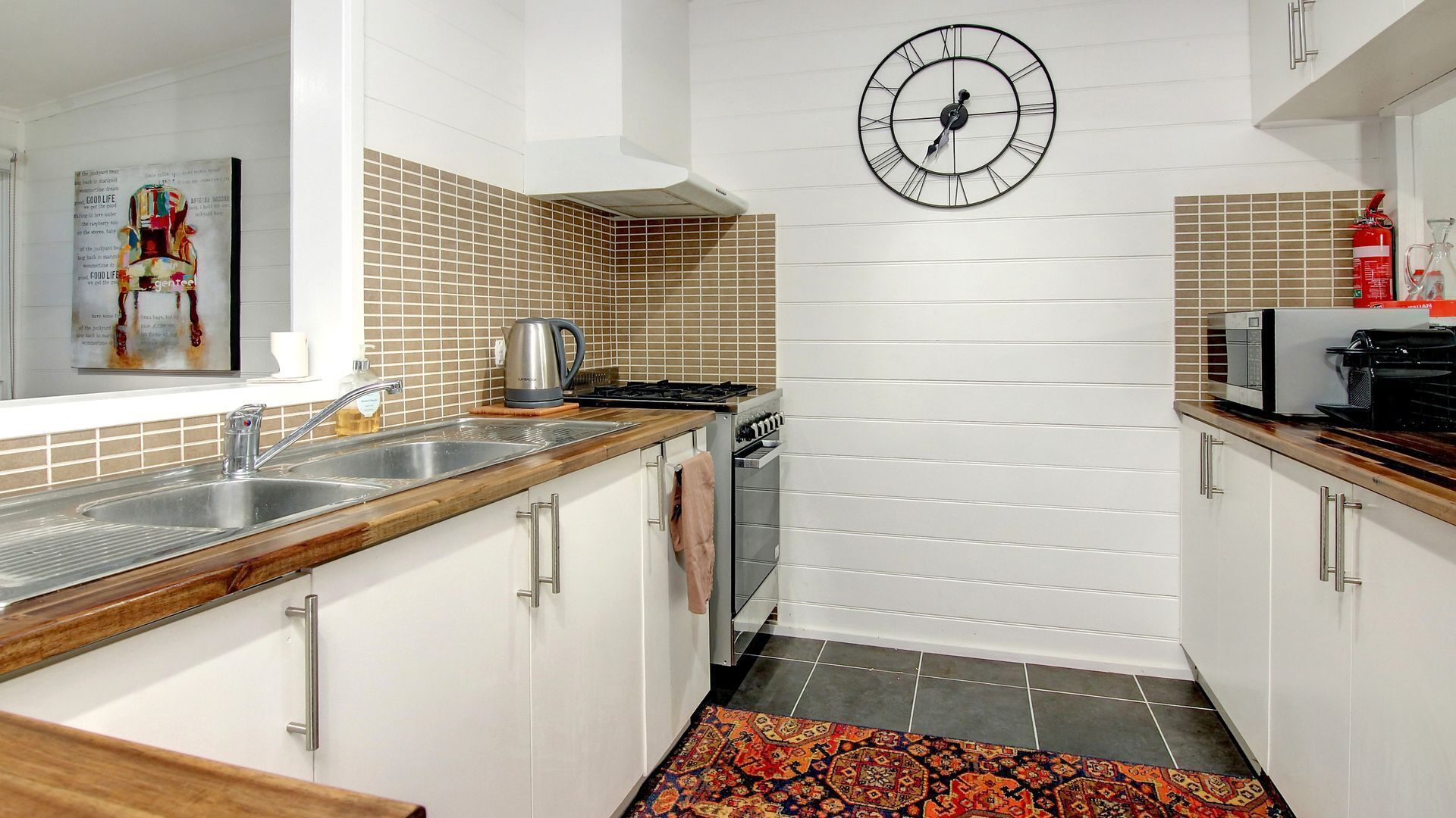 Sandwich toaster, coffee machine, soda stream, microwave, oven, dishwasher and a large fridge together with stone bench tops make the kitchen a complete solution away from home.