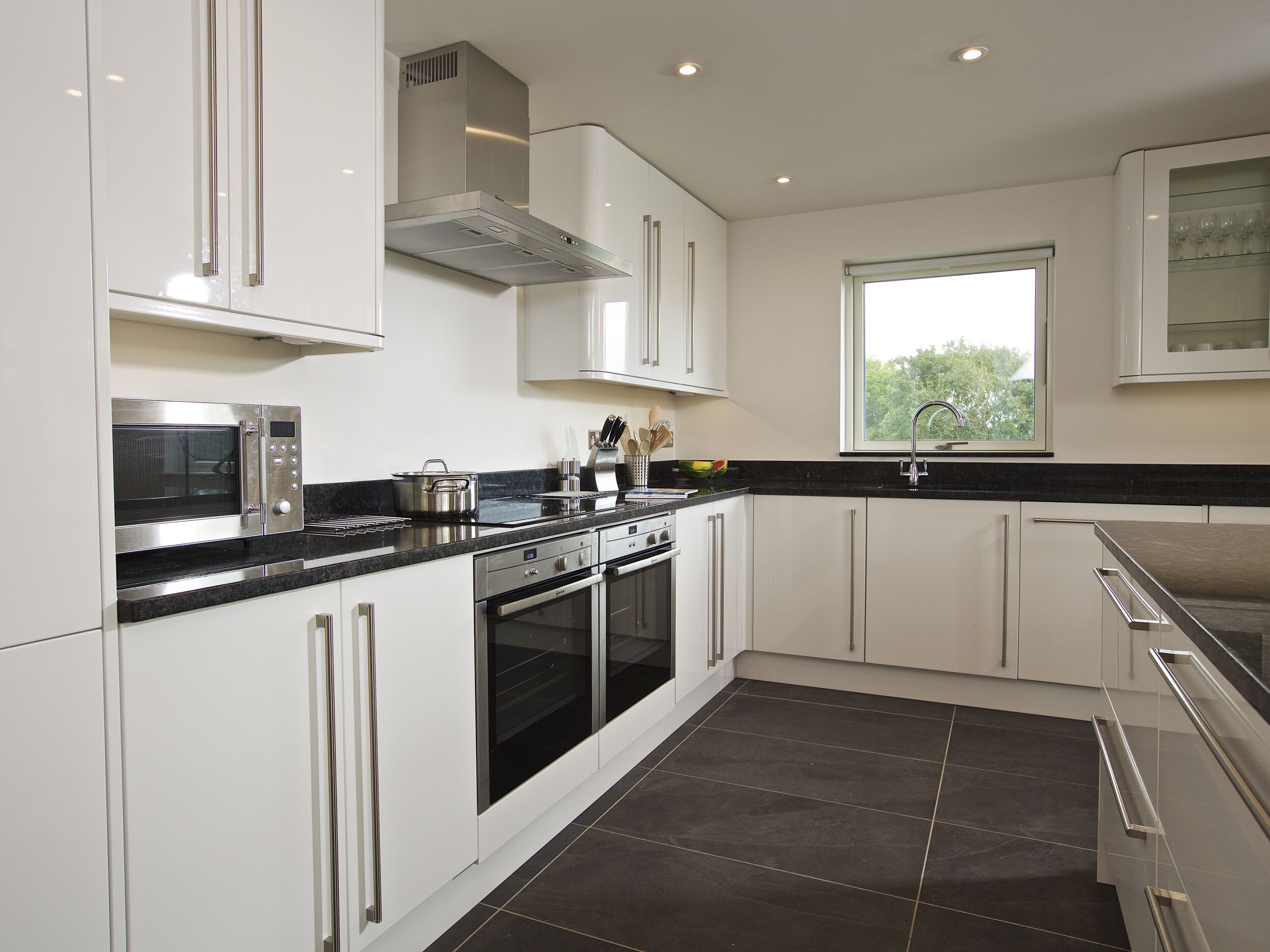 Kitchen area with electric cooker, gas hobs, fridge freezer, washing/dryer machine, dishwasher and microwave.