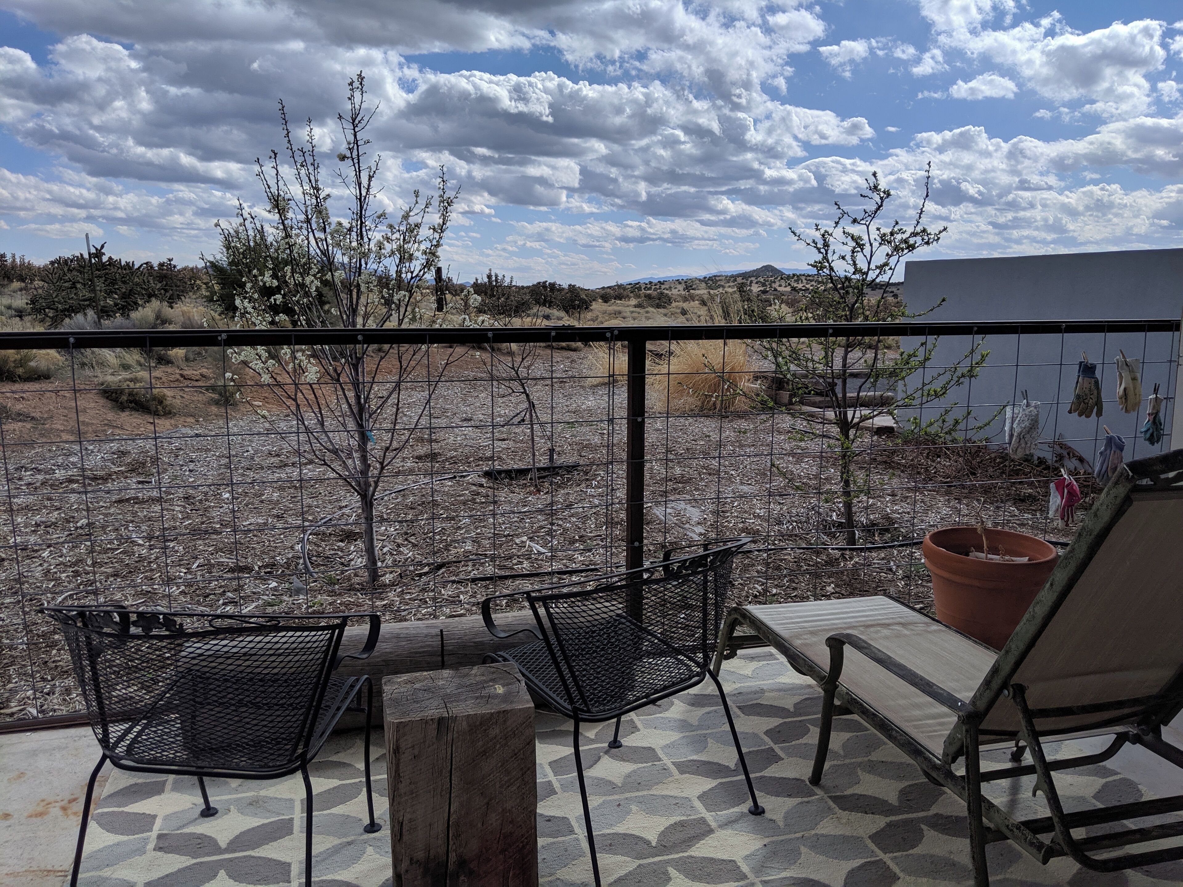 A magically rare find, located inside the village on a tree lined compound, the whisper quiet casita has uninterrupted views of the western mesa, sunsets, and stars. Full kitchen stocked with coffee, herbs, olive oil, ice, etc, offers everything needed to home cook an easy meal. The many sunny windows have blackout shades for a restful night’s sleep on a historic adobe property in the heart of the Galisteo River basin. Listen for a nesting owl and other colorful birds as they traverse the cross-country flyway. Catch a glimpse the original ATSF train twice daily crossing the railroad trestle near the edge of the compound (it’s country quiet except for these 2 trains). A traditional coyote cedar pole fence surrounds your private casita and parking. Come discover this magical hideaway and stay awhile :)