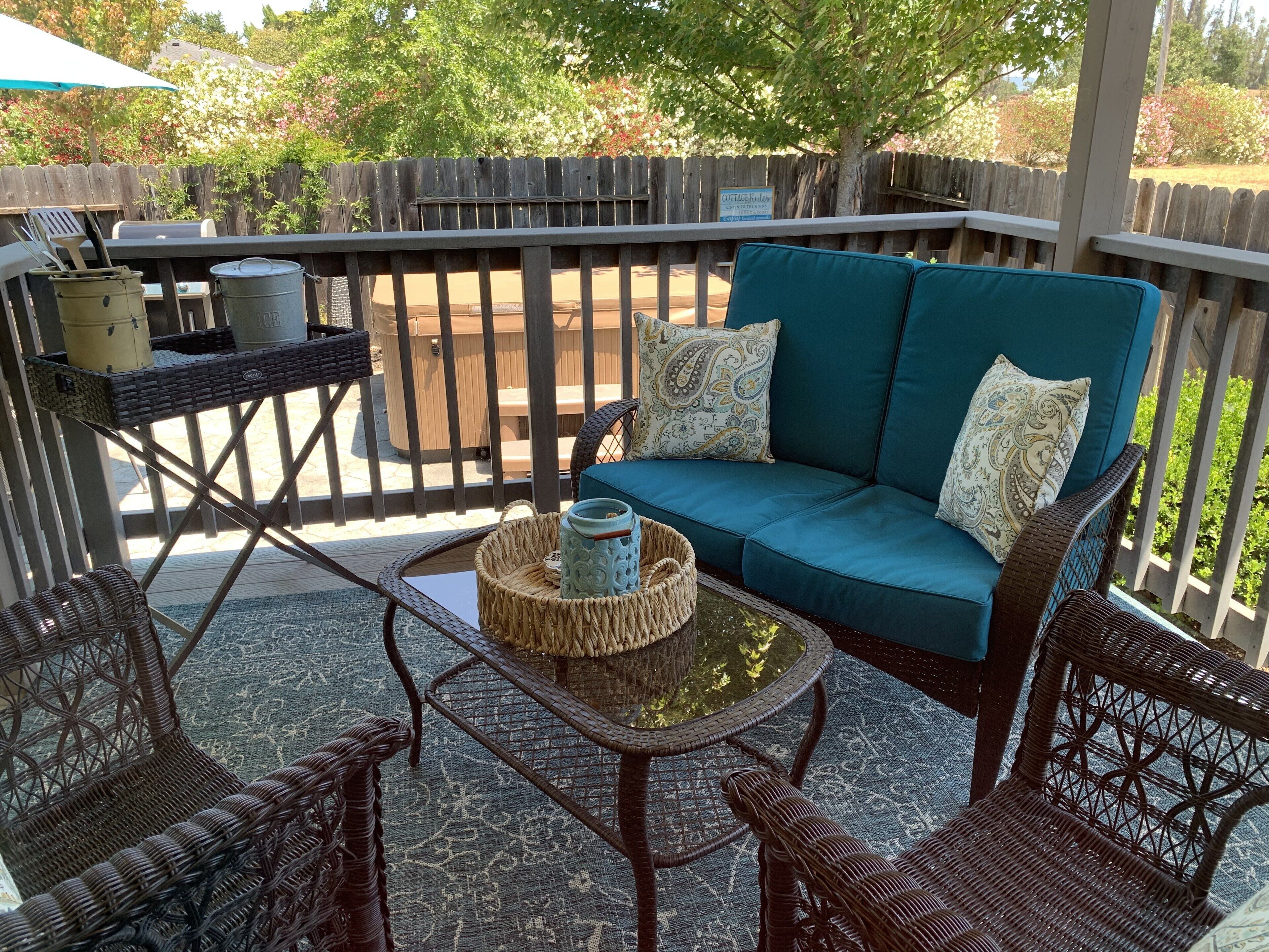 Come join us for a relaxing week or weekend at Woolsey Road Cottage! Nestled in the Russian River Valley is where you will find our beautiful cottage with a covered porch overlooking our orchard, an inviting hot tub and fresh eggs from our girls! Our beautifully designed 840 sf cottage is located on our family’s 7 acre property 10 minutes to Santa Rosa, 15 minutes to the Russian River, 15 minutes to Healdsburg, 45 minutes to the Napa Valley and 1 hr. to San Francisco. Our cottage is perfect for two couples, a friend's getaway weekend or a small family ( children over age 10 only).