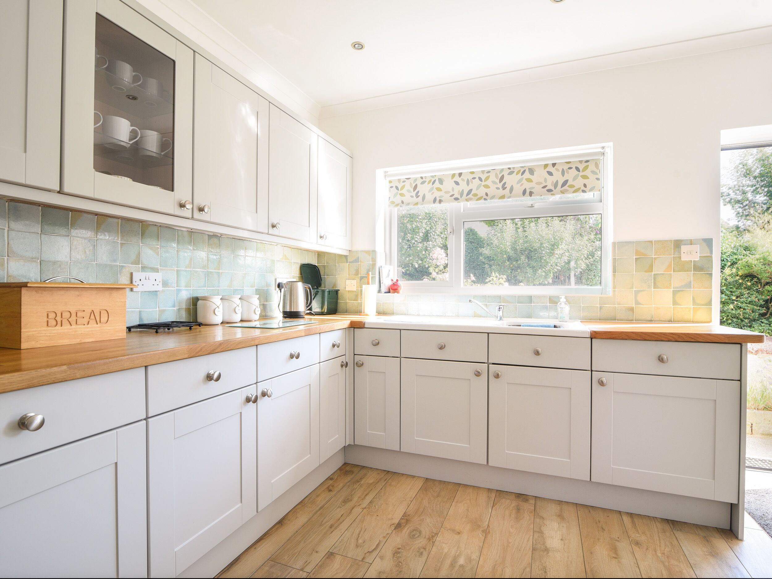 From the front door, you will enter the cosy living room, with beautiful colours setting a relaxing mood for your holiday. Snuggle up on the sofa and watch a good film on the TV after a busy day exploring the East Devon coast. To the rear of the property, accessed from the living room or back garden, is the kitchen. The charming kitchen is well equipped for preparing picnics, plating up for a BBQ or having a Sunday roast for those who love to cook. There is also a dining table and chairs for four guests in the kitchen. Upstairs is the master bedroom with a double bed, bedside cabinets, lamps and a wardrobe. Next to the master bedroom is the second bedroom with two single beds, a chest of drawers and some hooks on the back of the door for hanging space. The family bathroom has a bath with an overhead shower, and a lovely, heated towel rail.