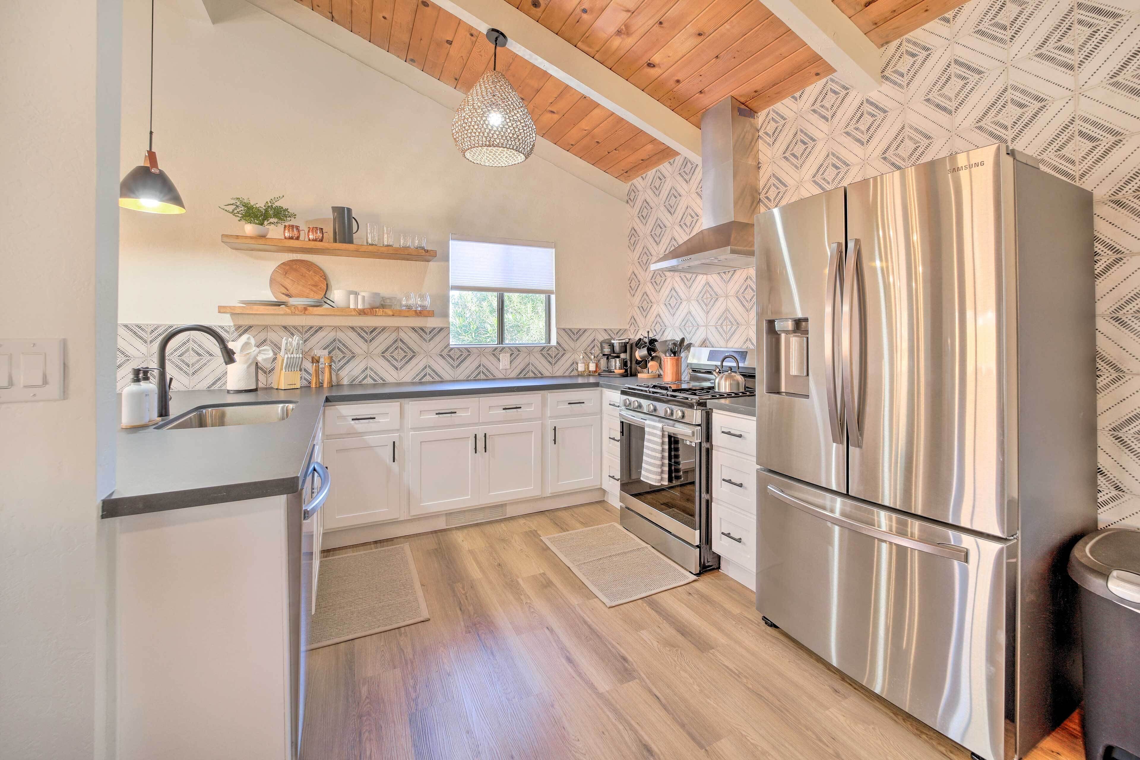 Cozy cottage, fully remodeled, everything modern and stylish. Enjoy your own cooking in the fully stocked kitchen with refrigerator, microwave, drip coffee maker, dishwasher, 2 burner stove and Magic Bullet essential personal blender. Beautiful Abott stoneware 16 piece dinnerware set, "Tasty" titanium ceramic non-stick cookware set. Olive oil, spices, salt, sugar, coffee, syrup, pancake mix are provided for you. For your use wine glasses, drinking glasses and plastic cups for outside, cooking utensils and wine bottle opener. Charging station for multiple devices at the bedside. Plenty of natural light to enjoy Red Rock views or wood blinds for privacy. Lots of wood and custom tile touches adorn this beautiful hideaway. Enjoy your enclosed hot tub and rain shower personal spa. You'll make lasting Sedona memories in this stylish adorable suite!