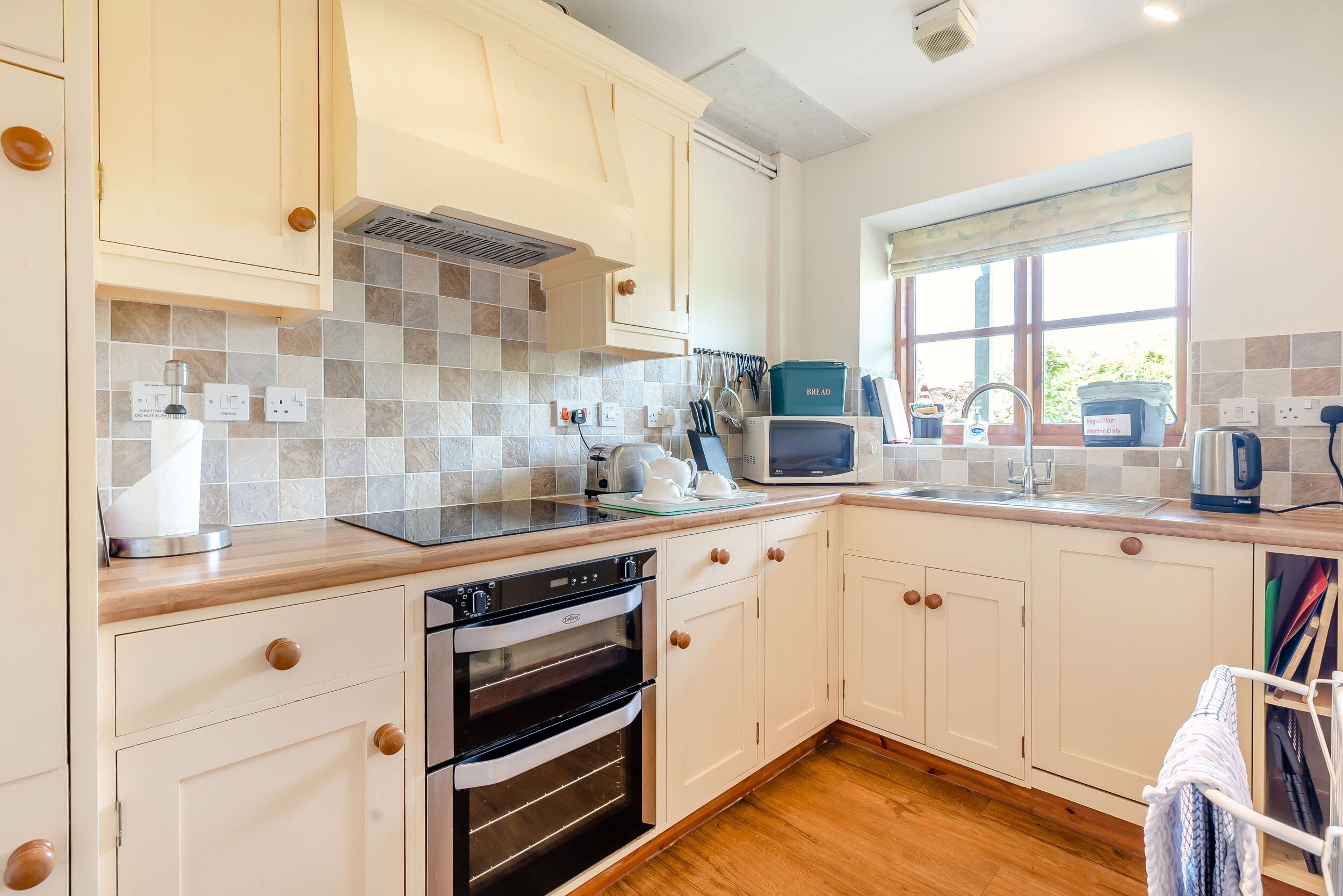 The spacious sitting room, complete with an electric fire, is the perfect place to relax after a day of exploring, while the bright and contemporary fully equipped kitchen - boasting an electric oven and hob, microwave, fridge, washer/dryer, and dishwasher - provides everything needed for a self-catered getaway.