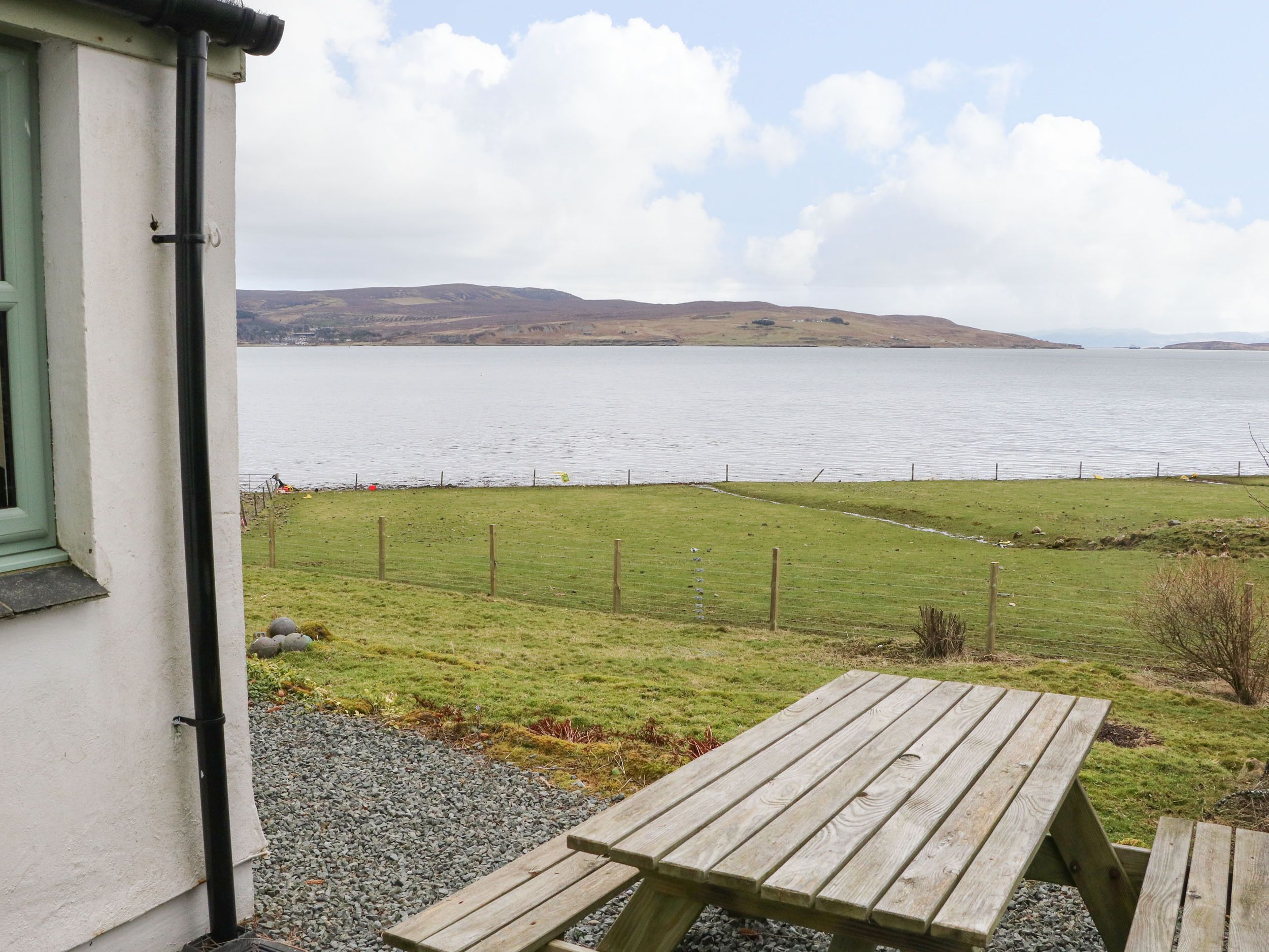 Bathroom: Bath, Toilet. Air source heat pump underfloor heating, electricity, bed linen, towels and Wi-Fi included. Initial fuel for wood burner included. Welcome pack. . Enclosed lawned front garden. Private parking for 2 cars. No smoking. Visit Scotland award. Please note: No children under 5 years old. This property has a security deposit of £250.. Visitors to the Isle of Skye and to Stone Cottage will not be disappointed. Conveniently positioned mere steps from the small train station, it is situated in one of the Island’s most picturesque spots with uninterrupted views from the bedrooms, dining area and the living areas, overlooking the Southern part of Skye (Sleat) and over to the Isles of Rhum and Eigg.